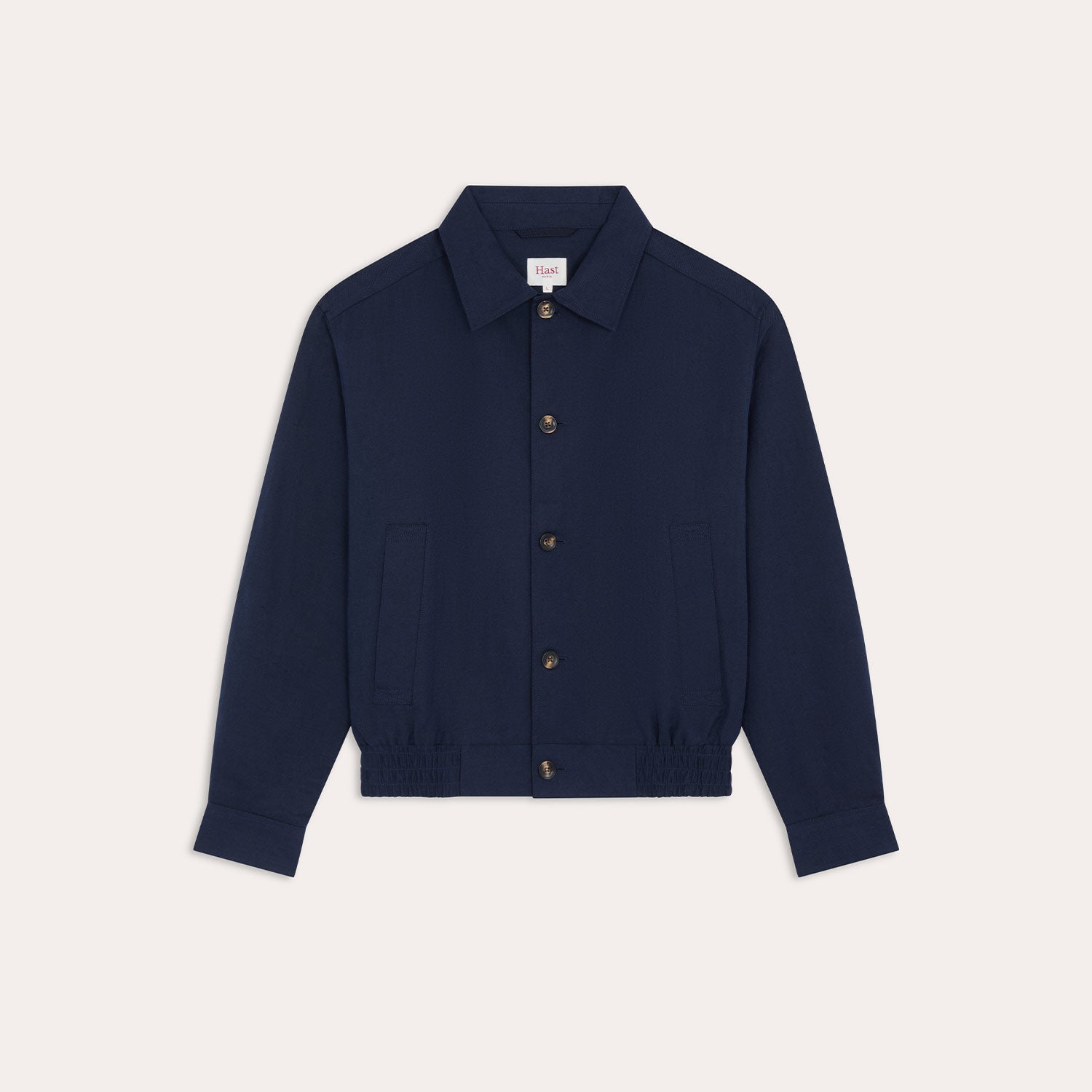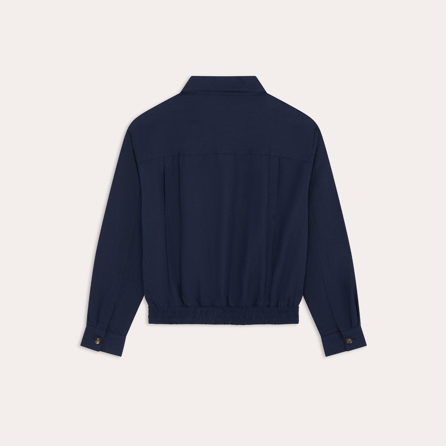 Its elasticated hem, buttoned cuffs, and back gusset offer comfort, freedom of movement, and a modern look. Unlined for summer and featuring two welt pockets at the front, it perfectly complements any outfit.