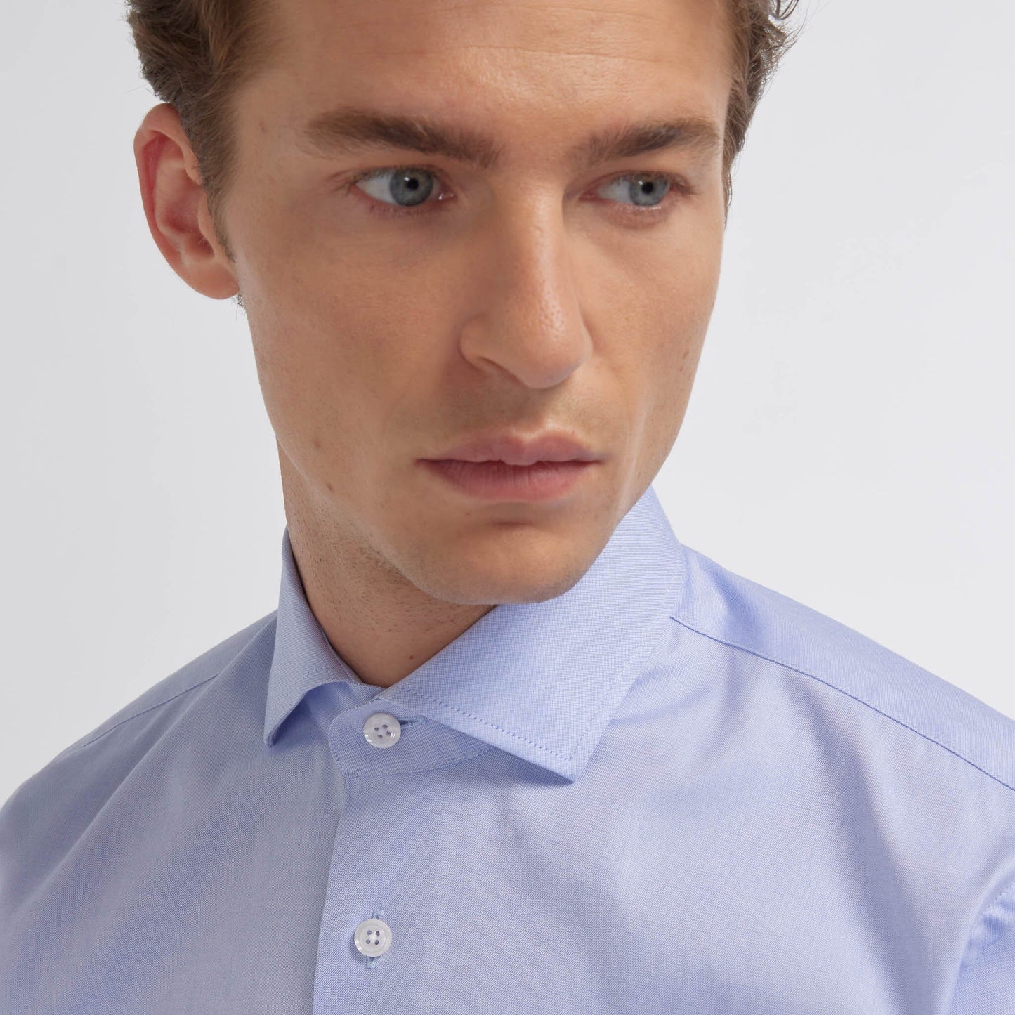 This blue, 100% double-ply cotton Oxford shirt will enhance any outfit. Blue is a timeless color, flattering to all skin tones, and lasting through the seasons without ever losing its elegance.