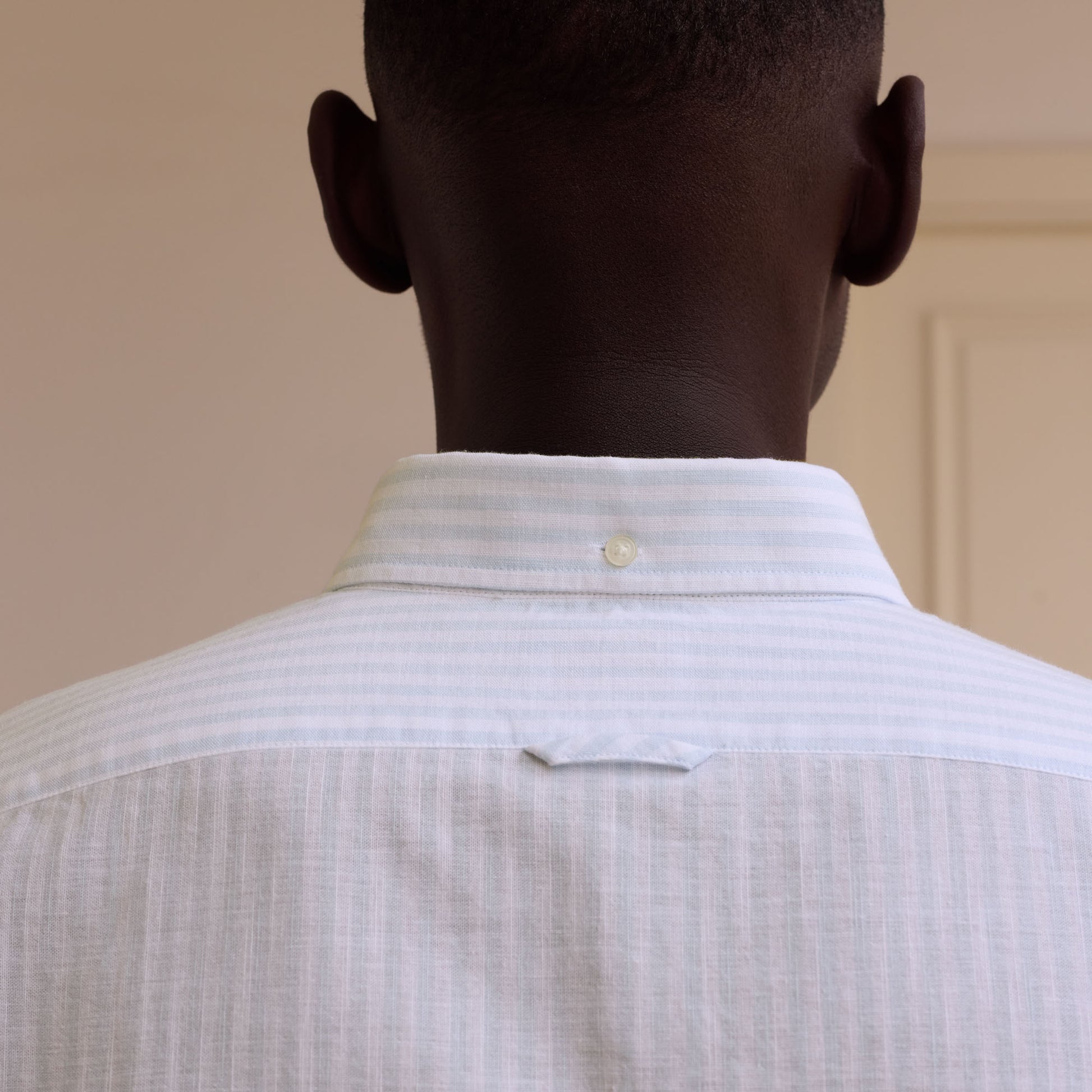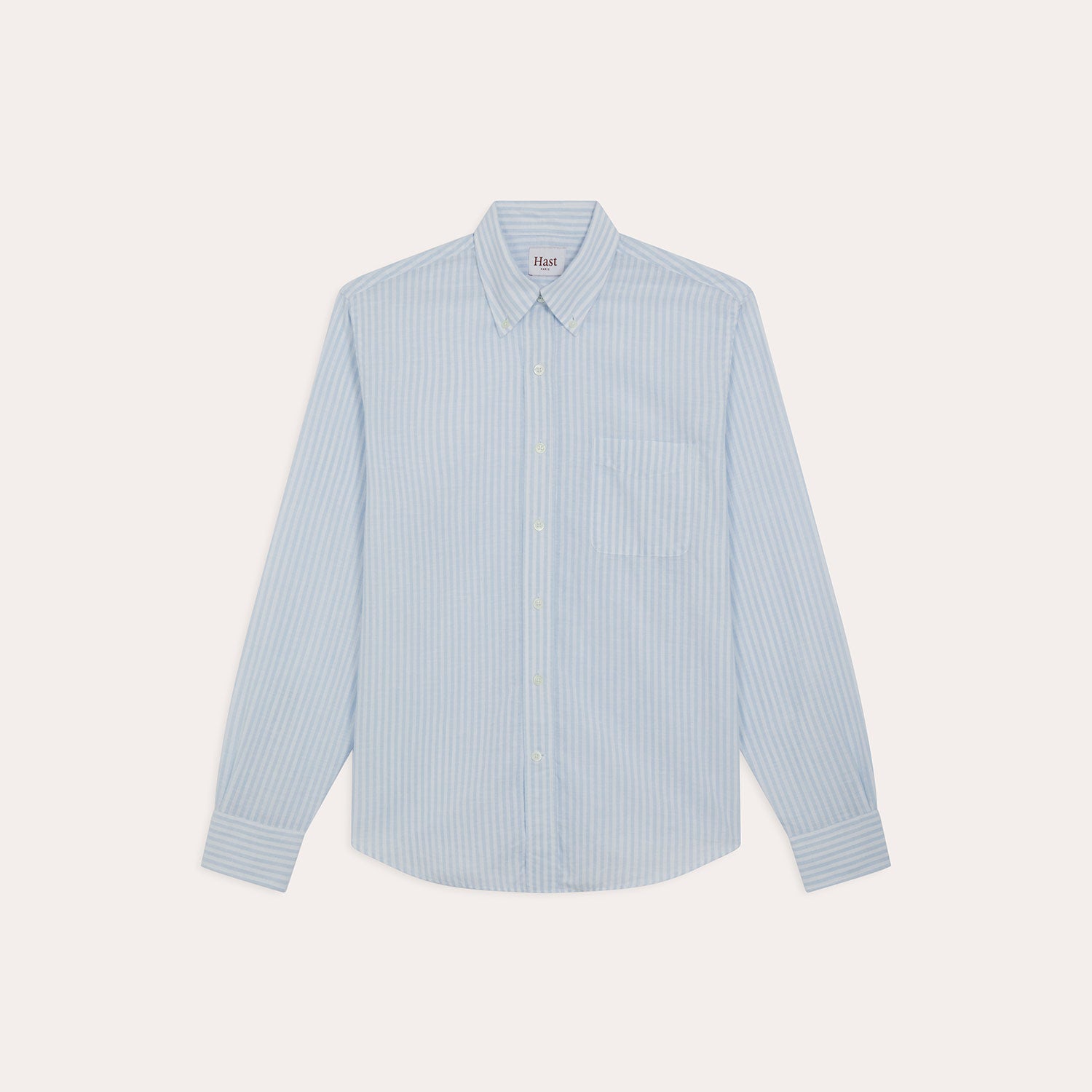 Sky blue stripes and a classic formal cut create a balanced piece. A shirt designed as a wardrobe staple, where structure takes precedence over style.