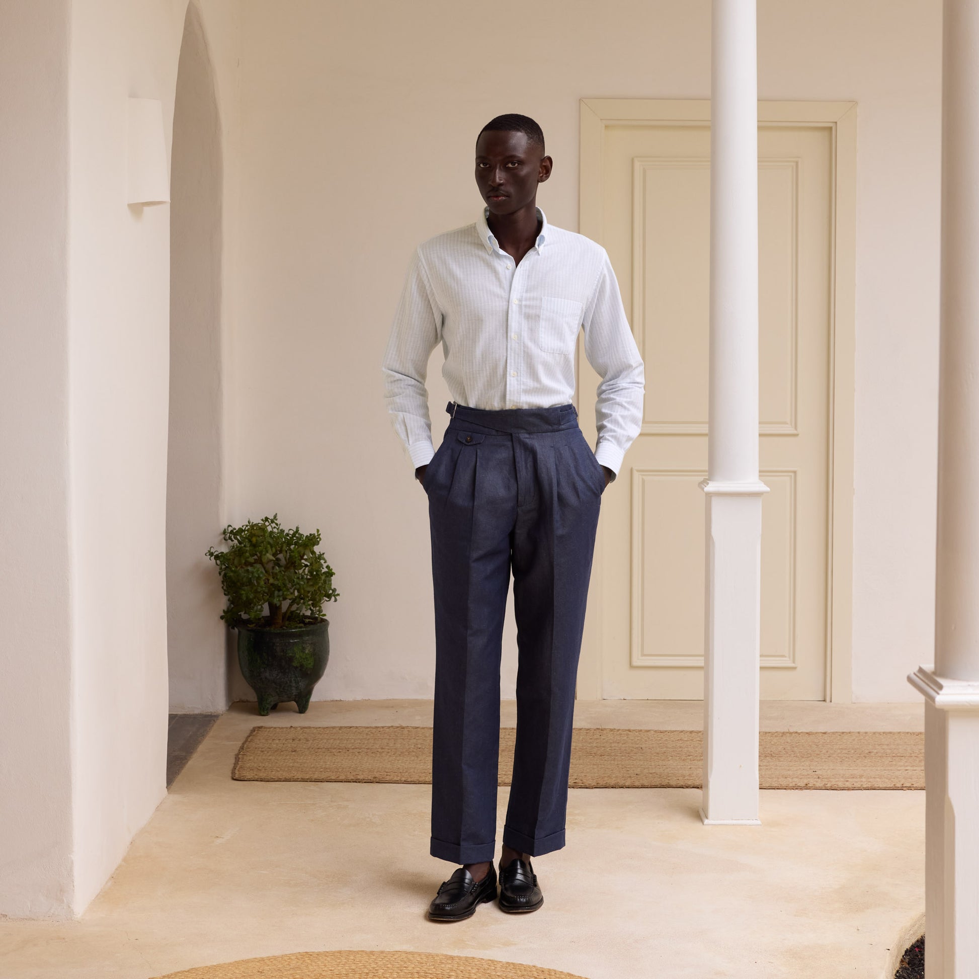 The lightweight (115g/m²) 100% cotton slub fabric, certified Oeko-Tex, ensures breathability and durability. The stripe adds texture without disrupting the overall simplicity.