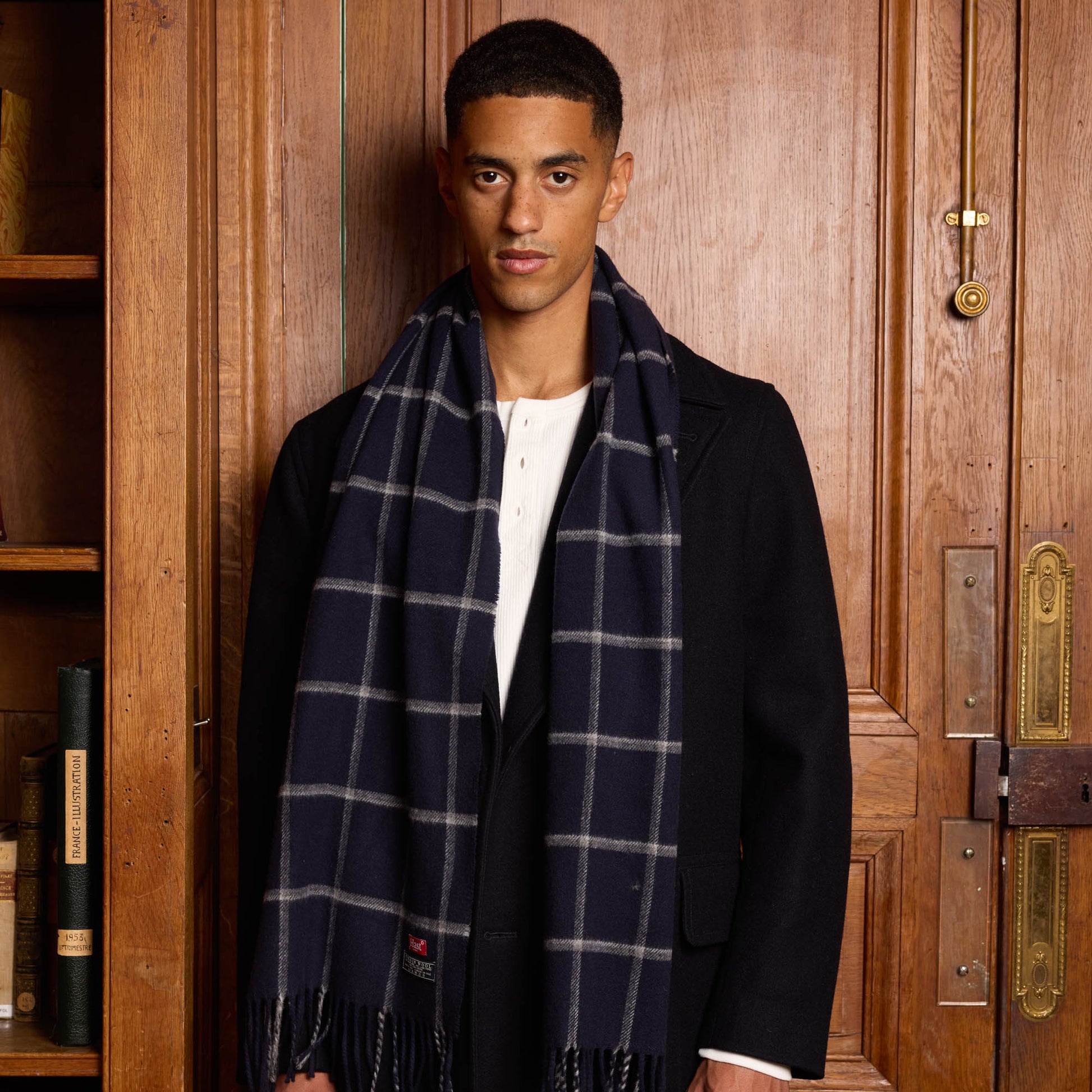 Our navy checked virgin wool scarf made in Italy keeps you warm all winter long, easily pairing with all your formal or casual outfits.