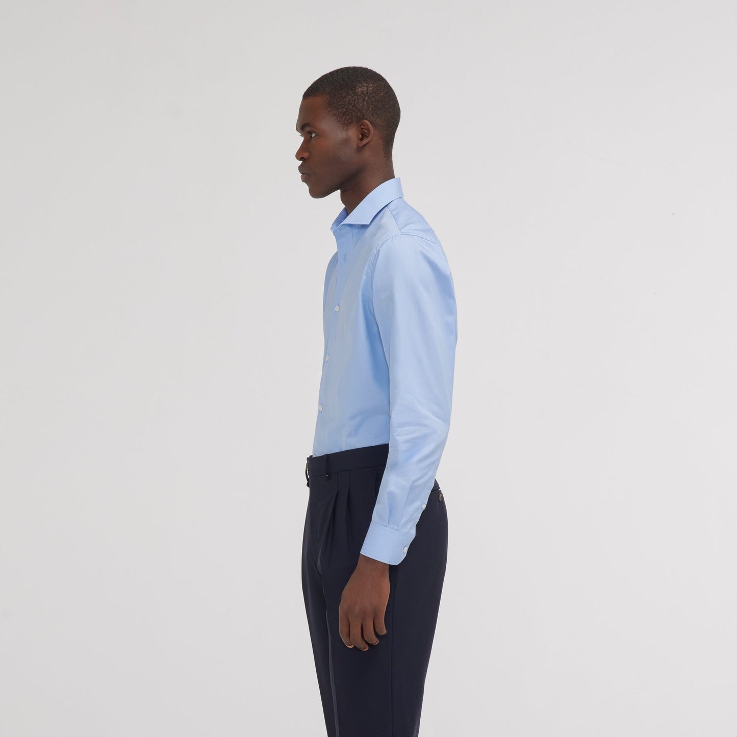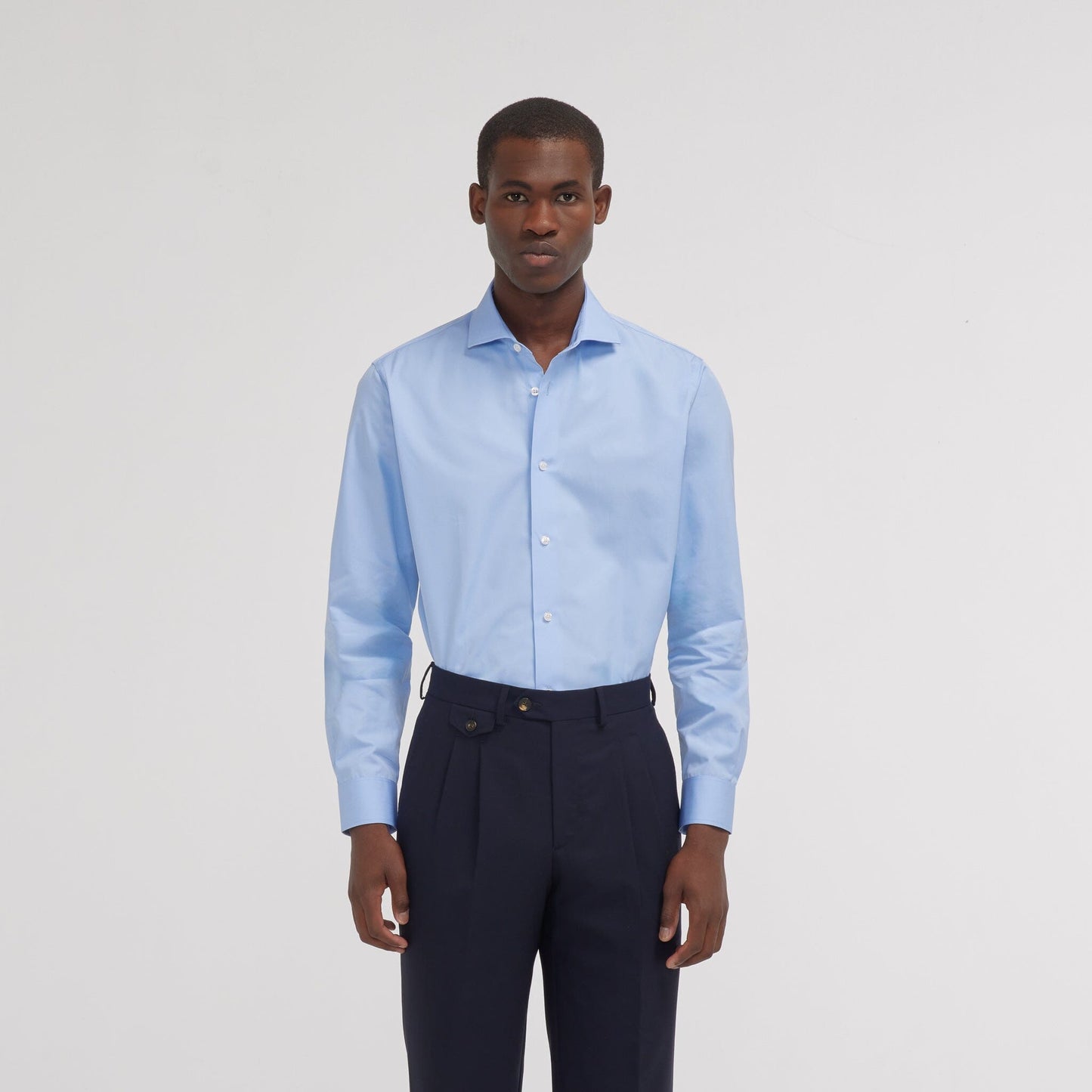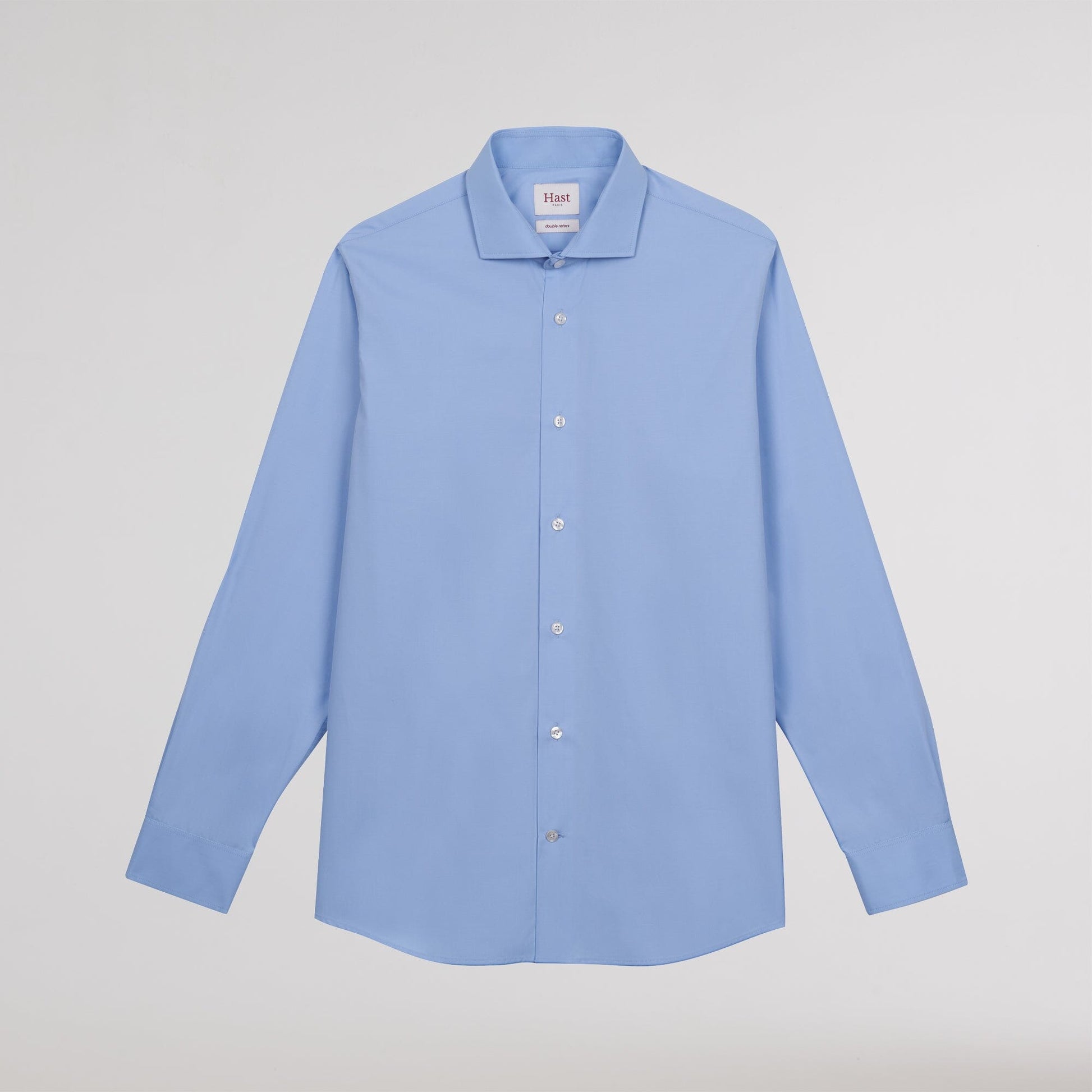 This 100% double-ply cotton poplin shirt will enhance any outfit. Blue is a timeless color, flattering to all skin tones, and lasting through the seasons without ever losing its elegance.