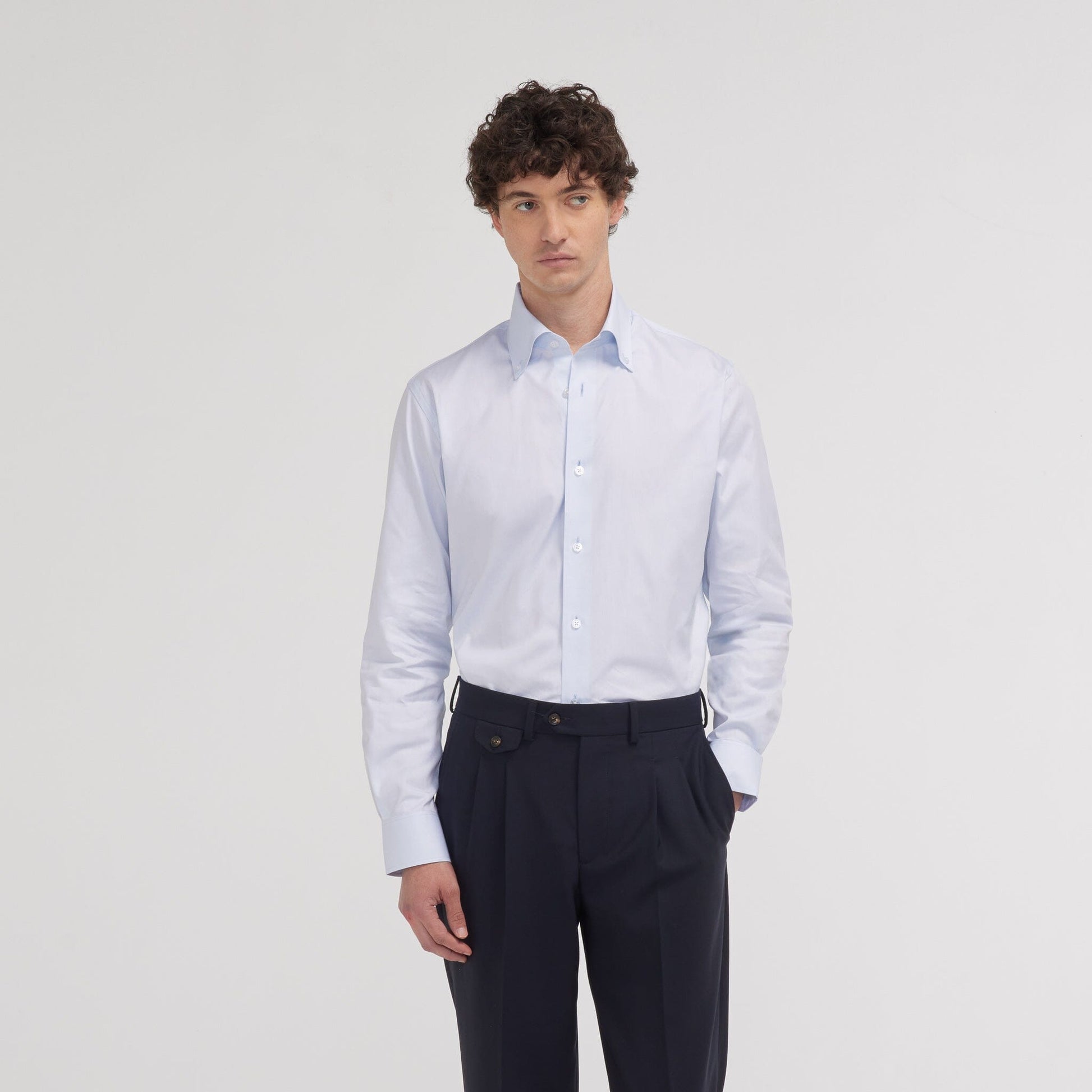 The fitted cut of this shirt is enhanced by its large 9-centimeter buttoned collar. It is made of 100% sky blue double-twisted cotton Oxford. The use of double twisting allows for a softer and more durable shirt.