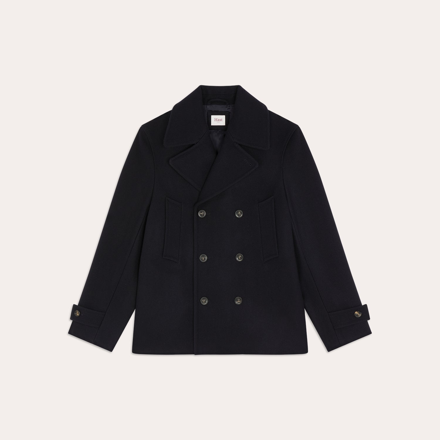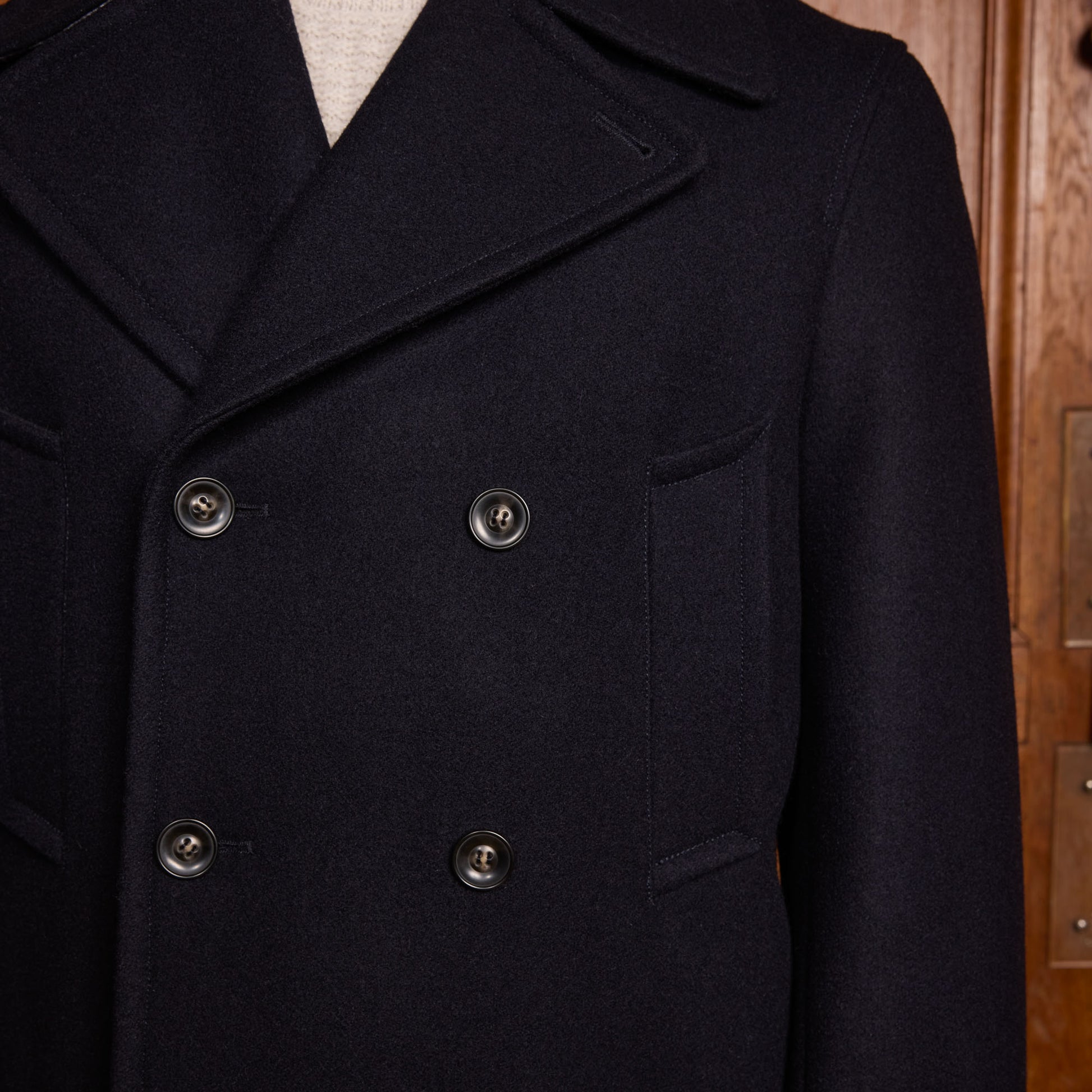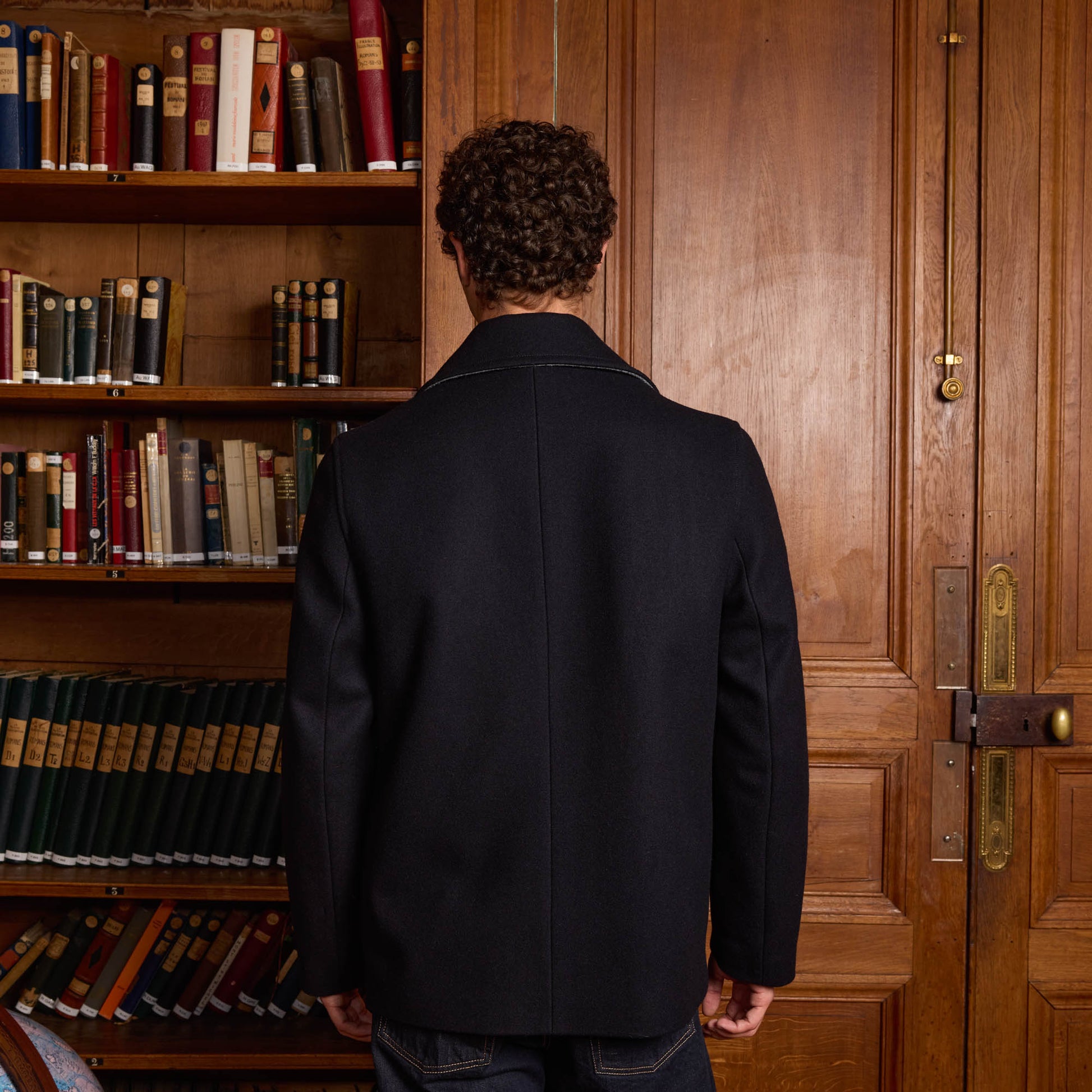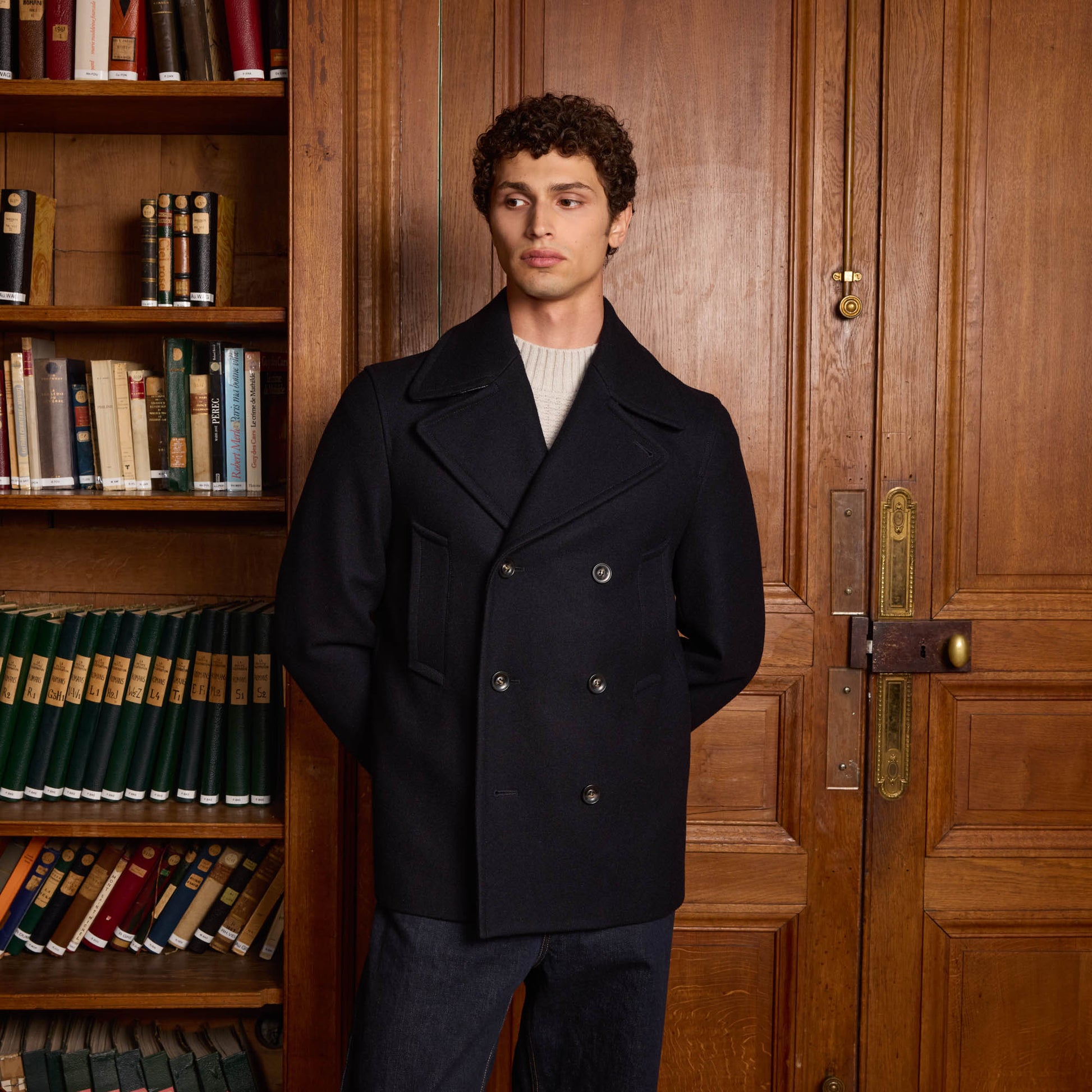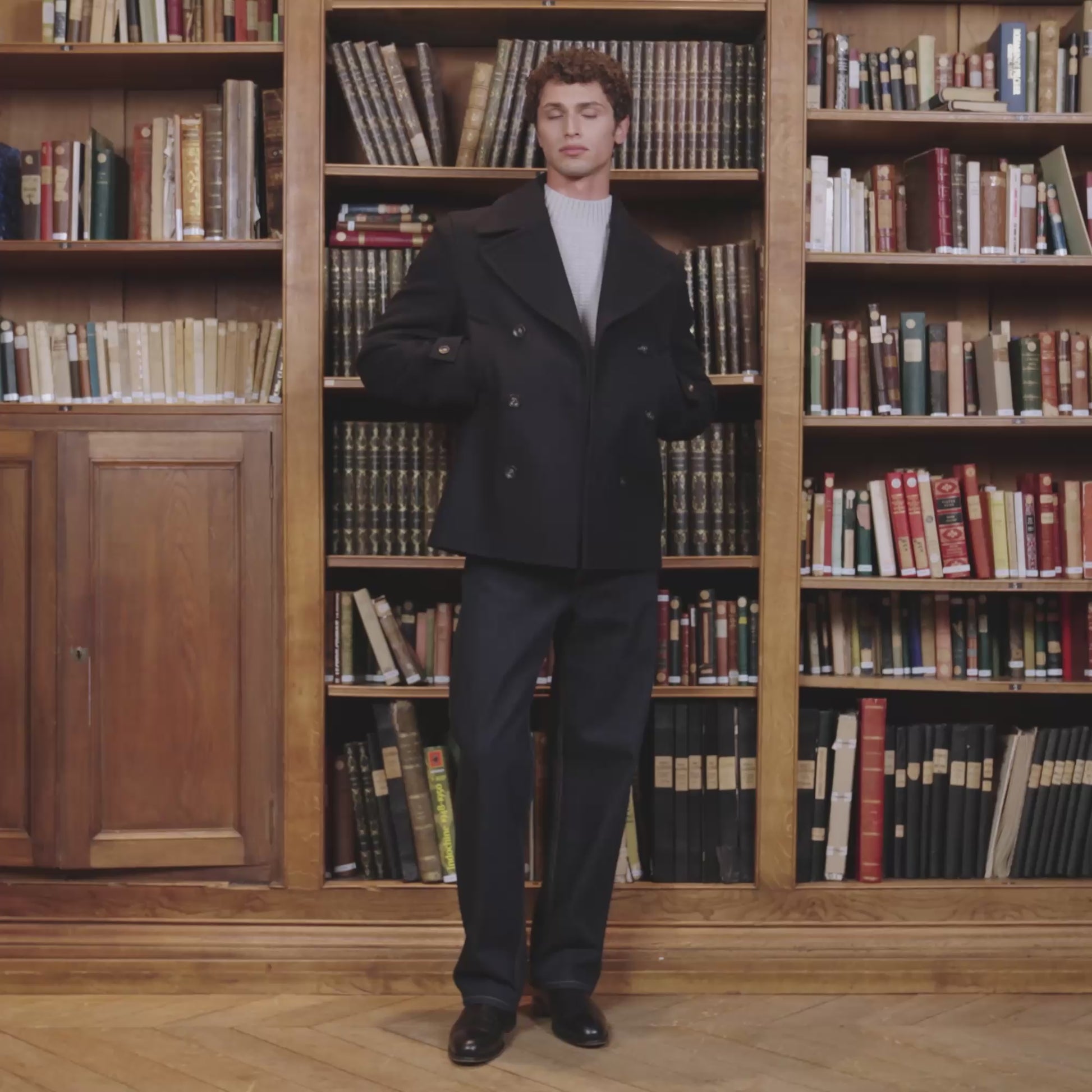 For the first time, we unveil our interpretation of the pea coat, a classic in menswear. Made from dense 490g/m² wool, this coat combines warmth and elegance. Its deep navy hue gives it a timeless look, perfect for elevating both formal and casual outfits.