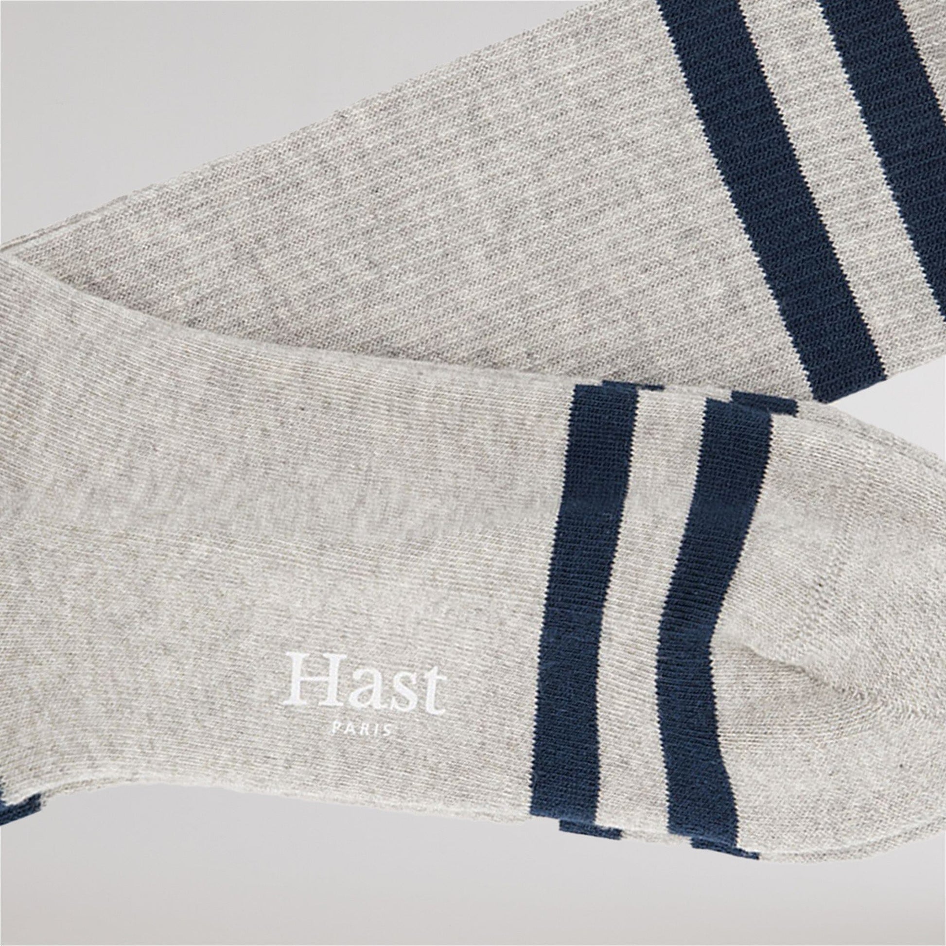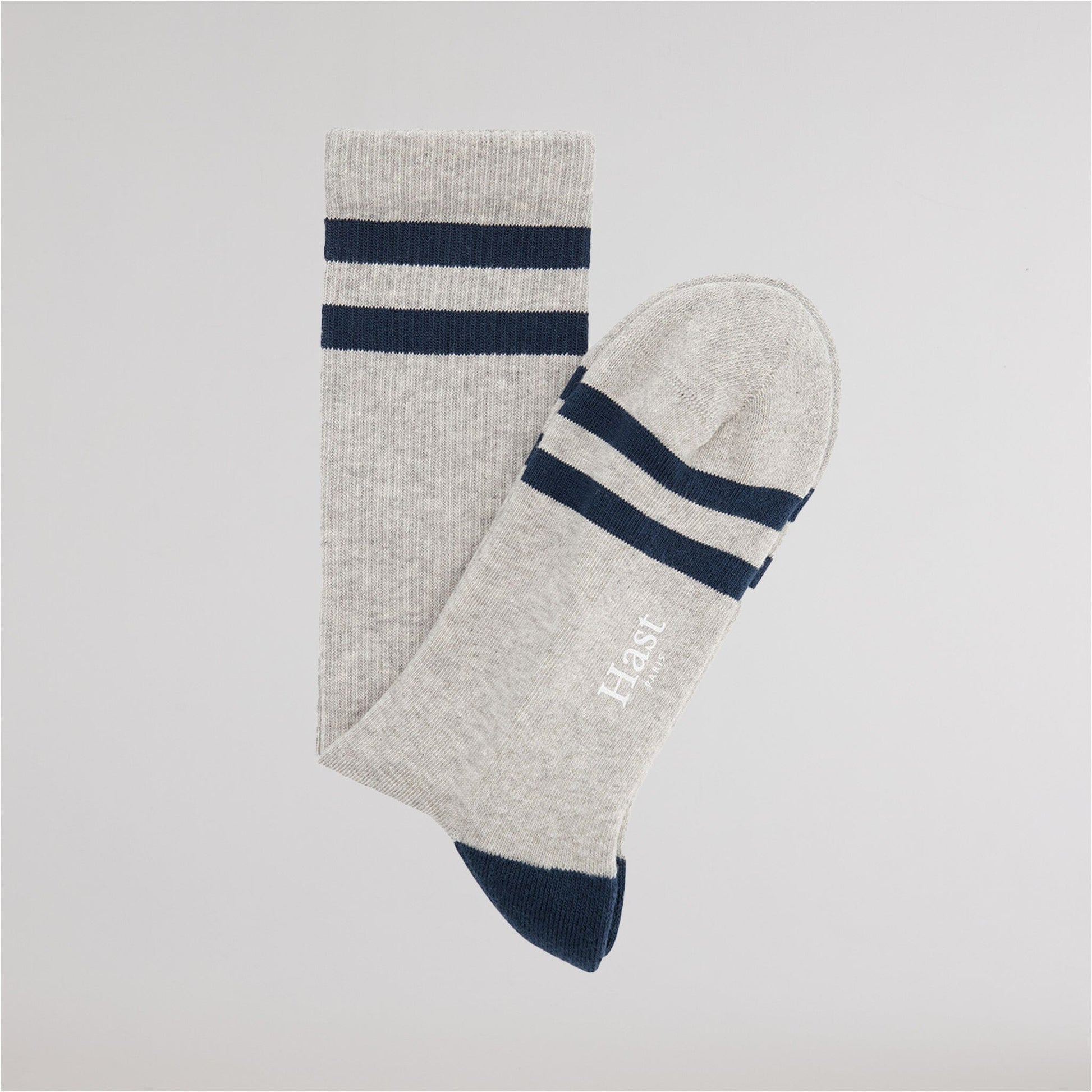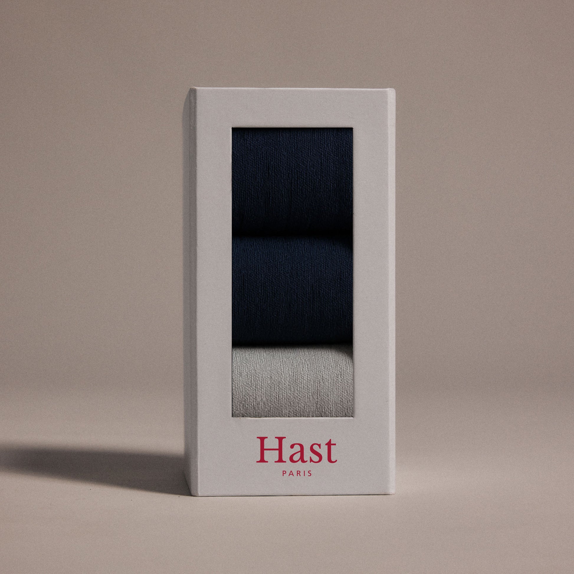Discover our three-pack of striped socks, featuring two pairs of navy and gray striped socks and one pair of gray and navy striped socks. They are presented in an elegant box. Made from quality cotton, these essential accessories combine comfort and understated style. Ideal for adding a touch of distinction to your everyday outfits, they make a perfect gift for those who appreciate timeless elegance.