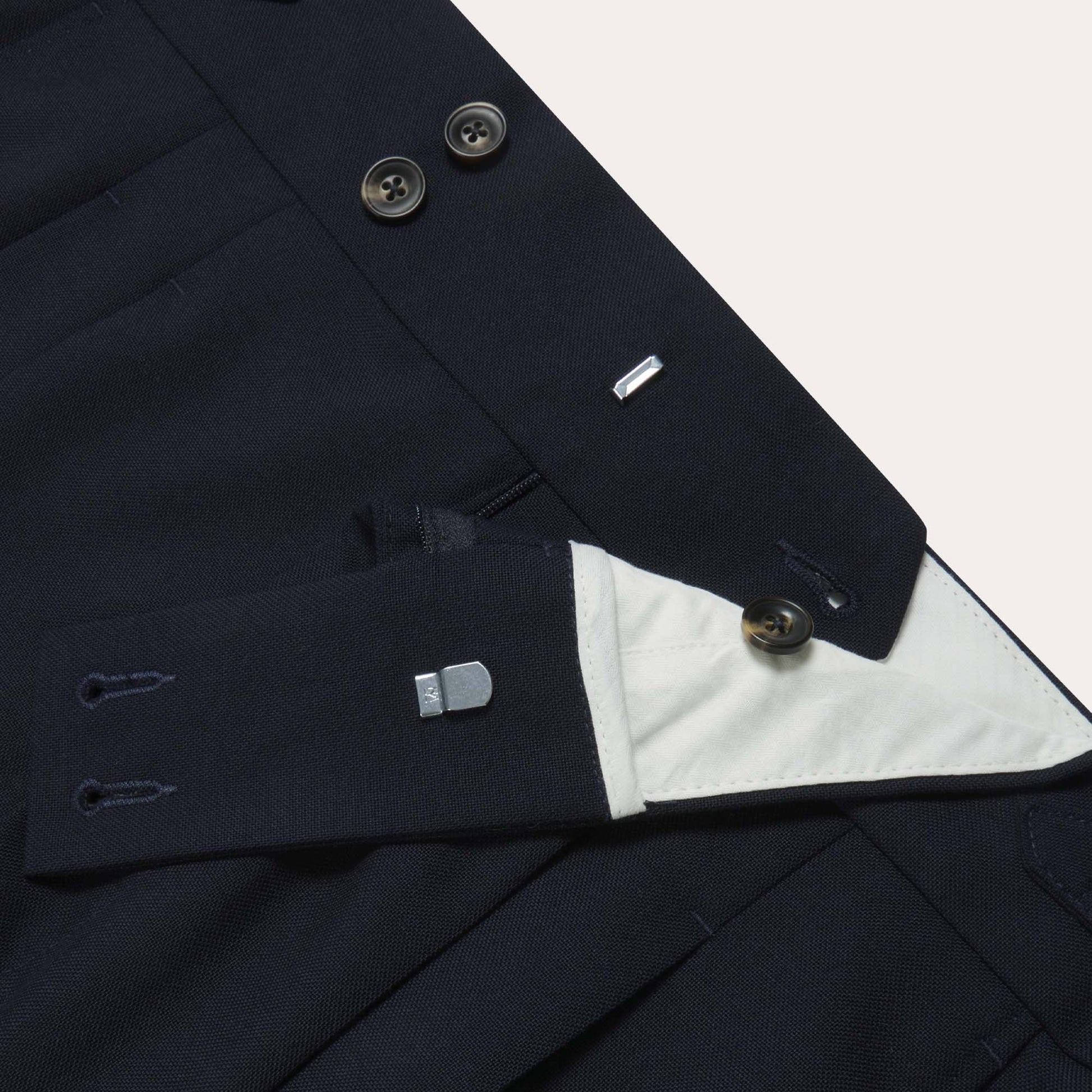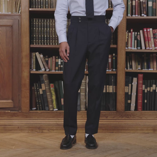 Inspired by the Gurkha, these pants are a sartorial creation, crafted from beautiful triple-ply Italian wool from Marzotto. With their side adjusters and slightly higher waist, they will delight lovers of elegance. Their navy blue color makes them easy to pair.