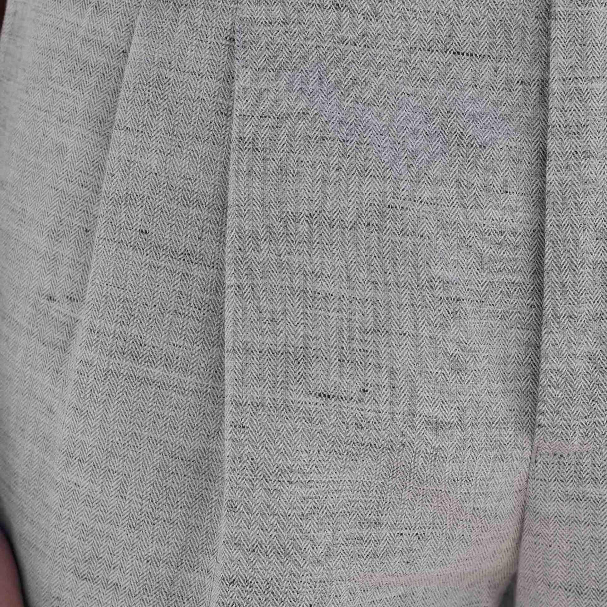 These pants are crafted from a beautiful, lightweight, and breathable heather gray linen and cotton fabric. Their micro-herringbone weave adds depth and texture.