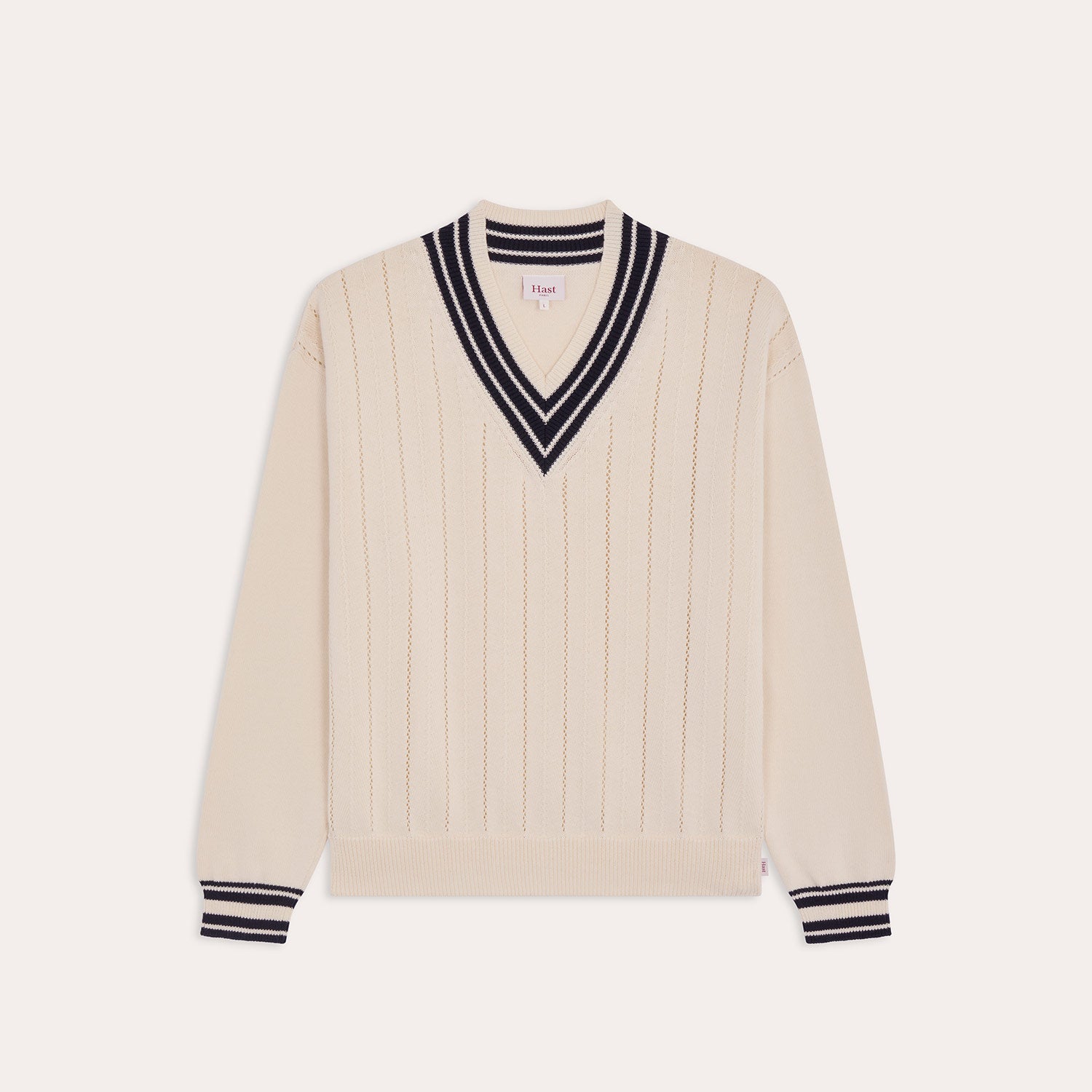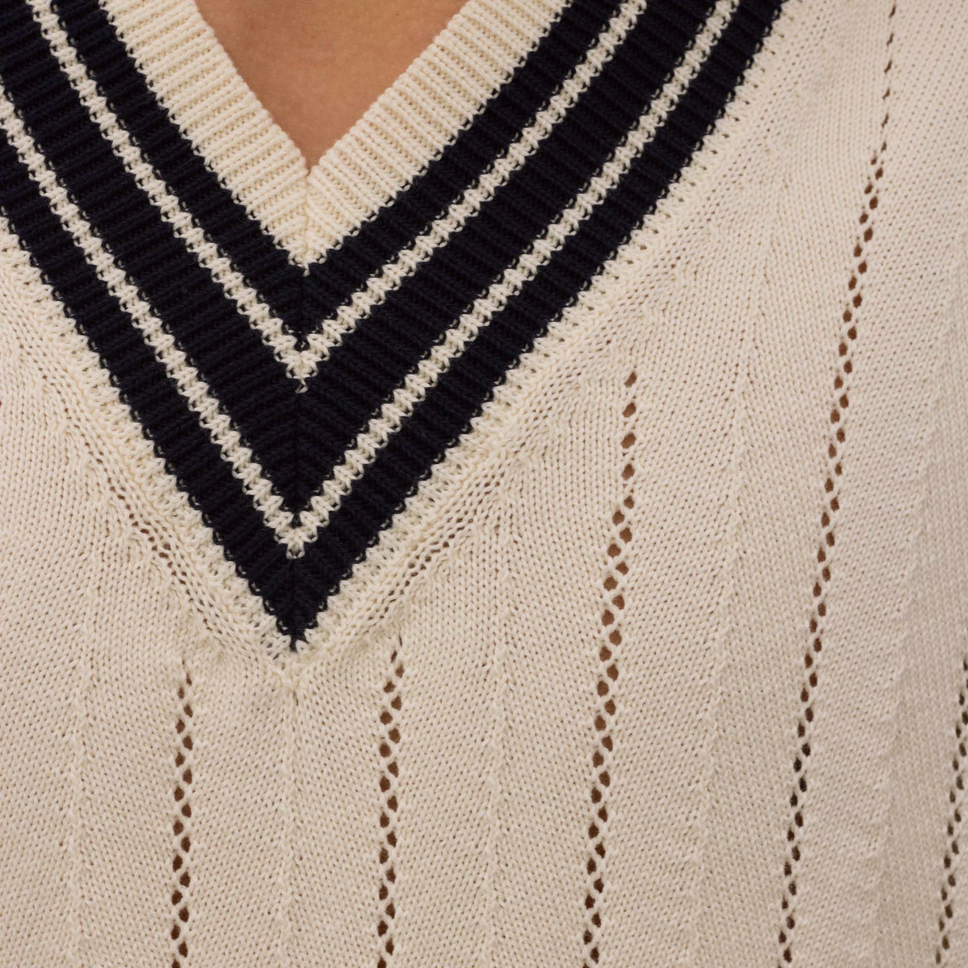 White V-neck sweater highlighted with navy contrasts, inspired by cricket attire. A luminous piece, structured by the interplay of contrasts and the precision of the knit.