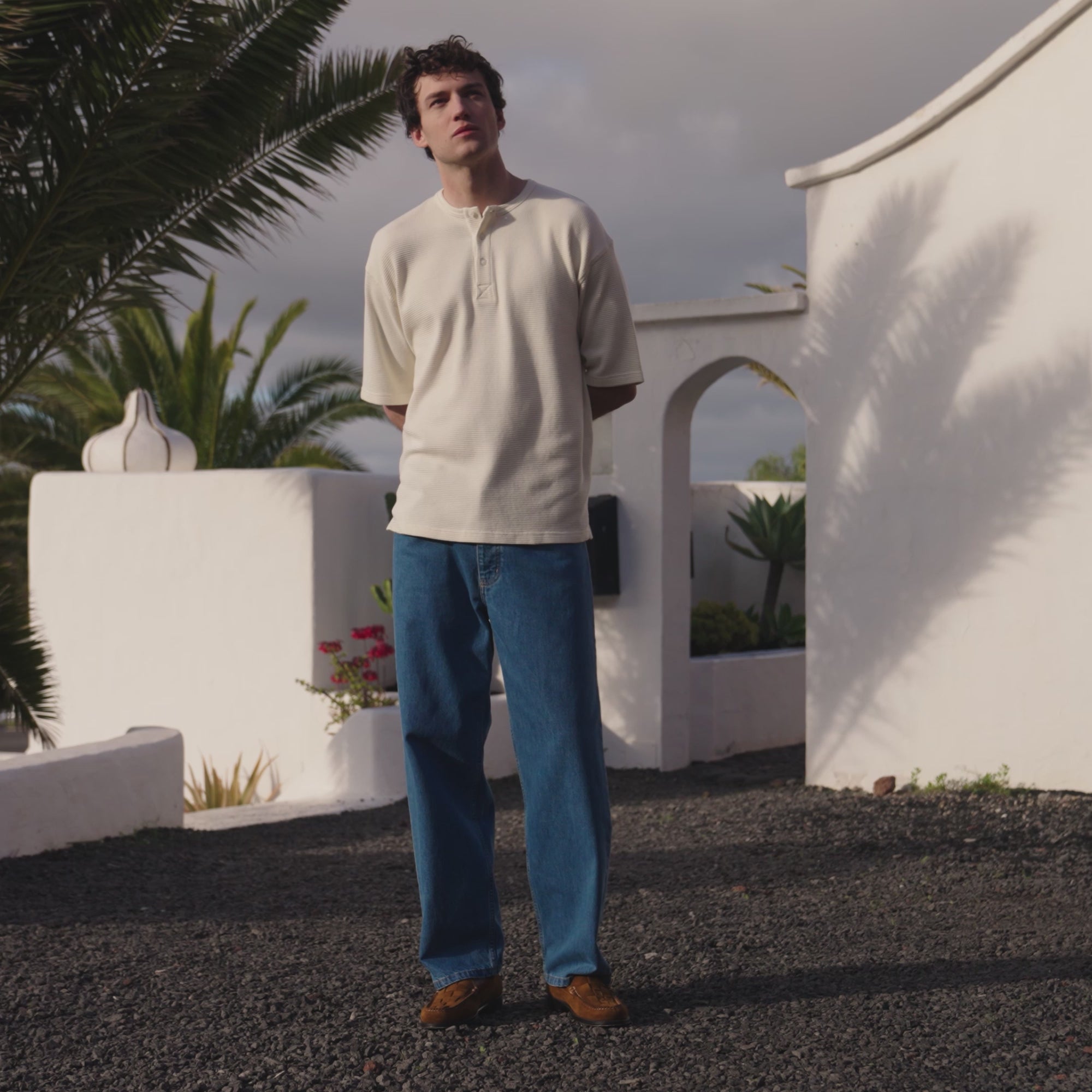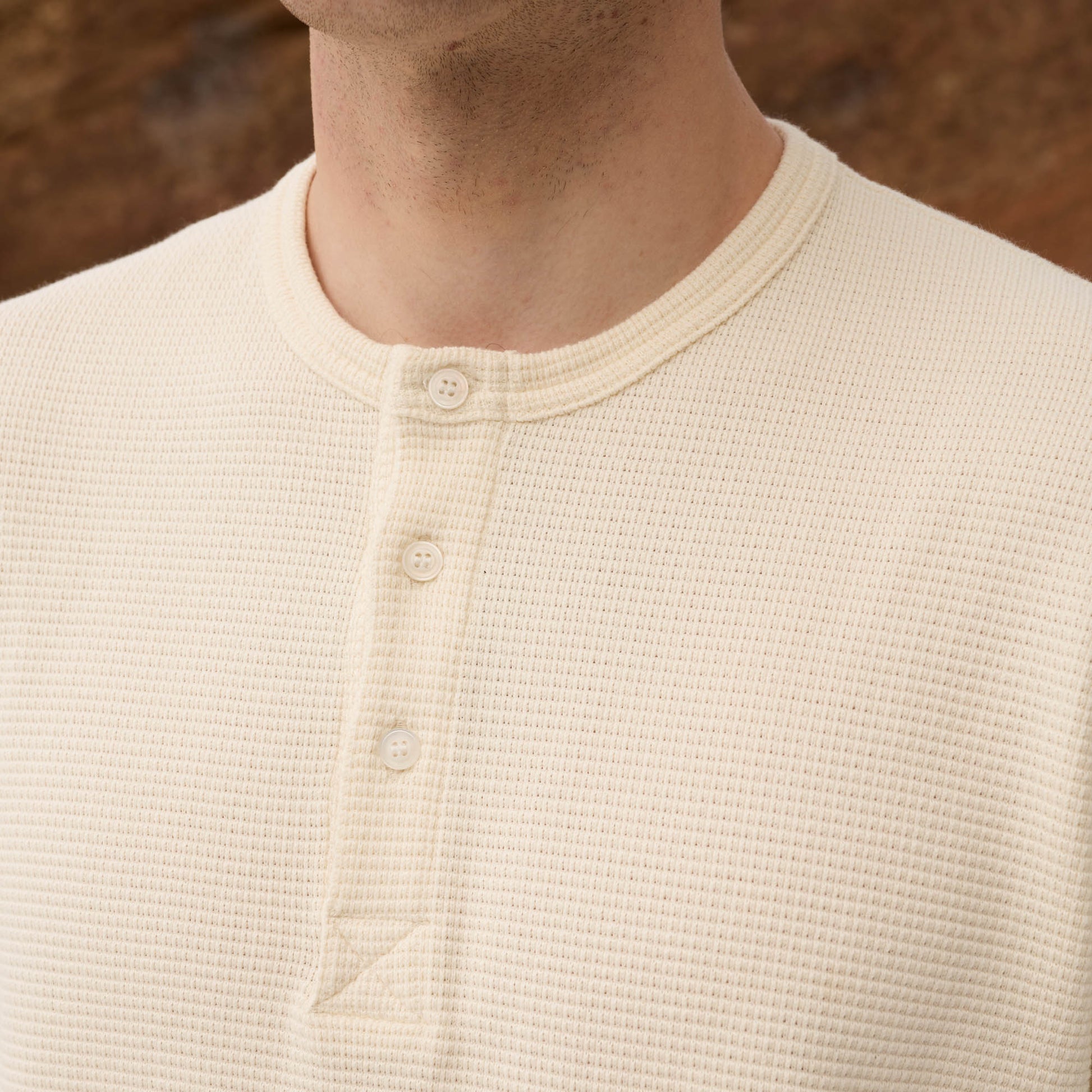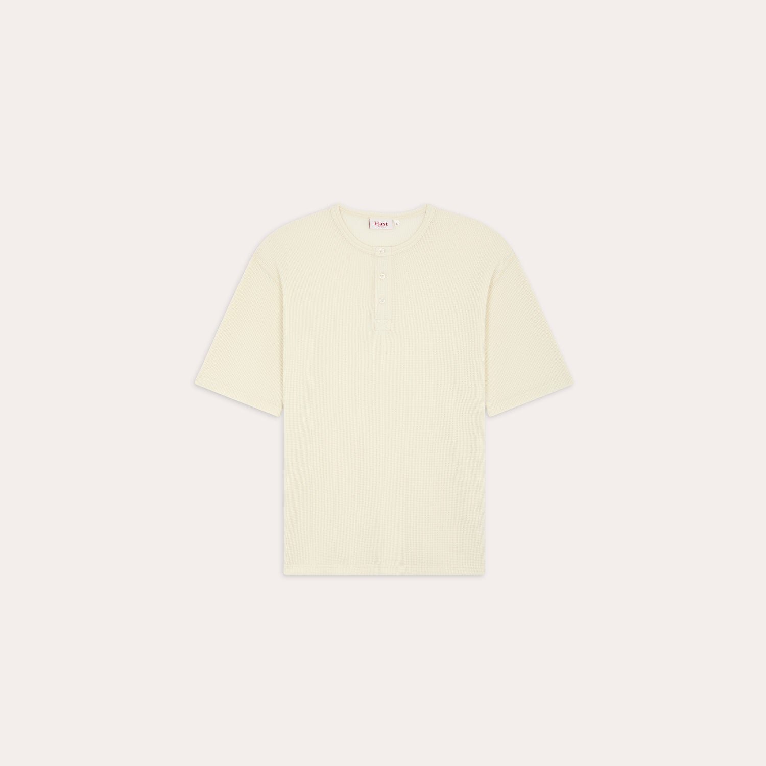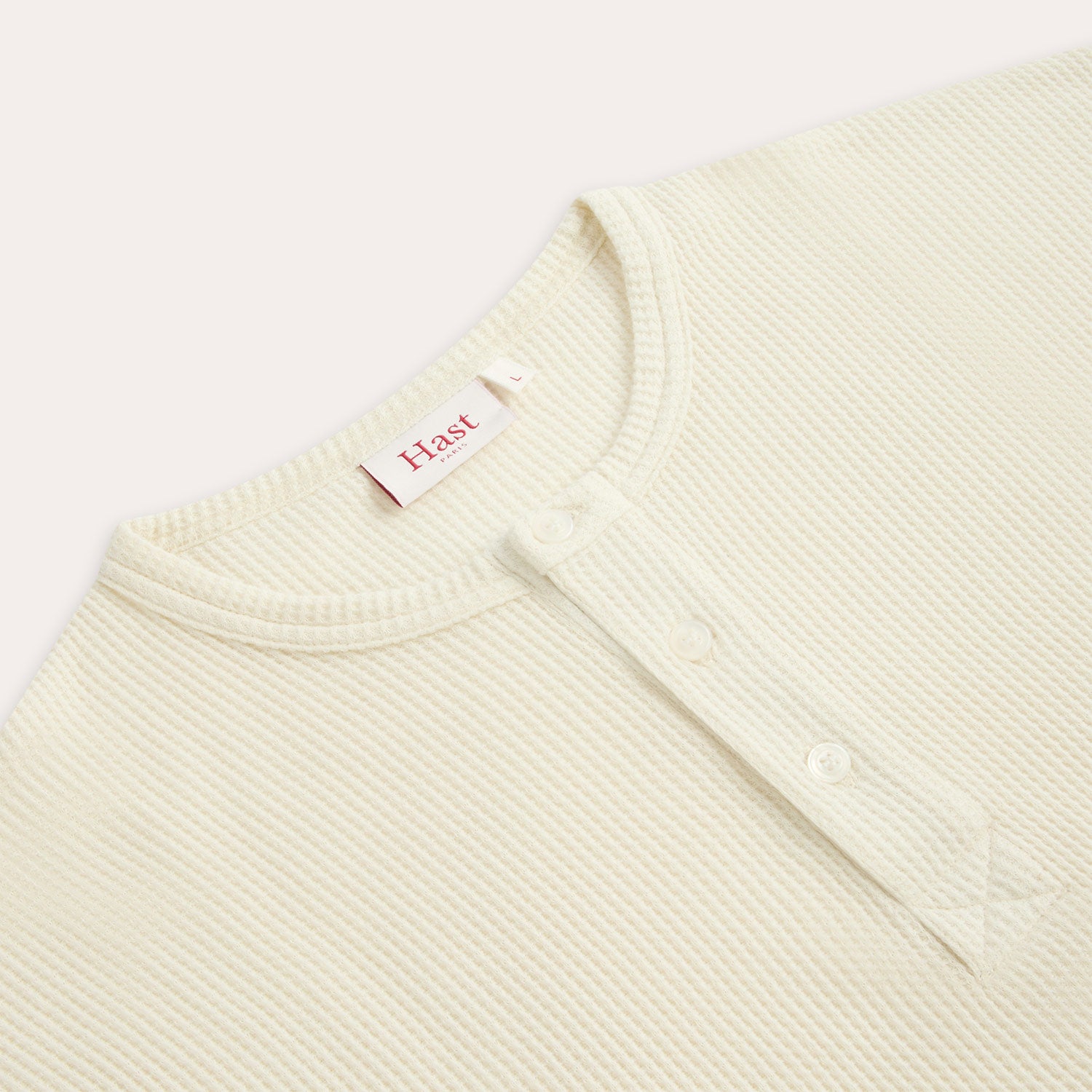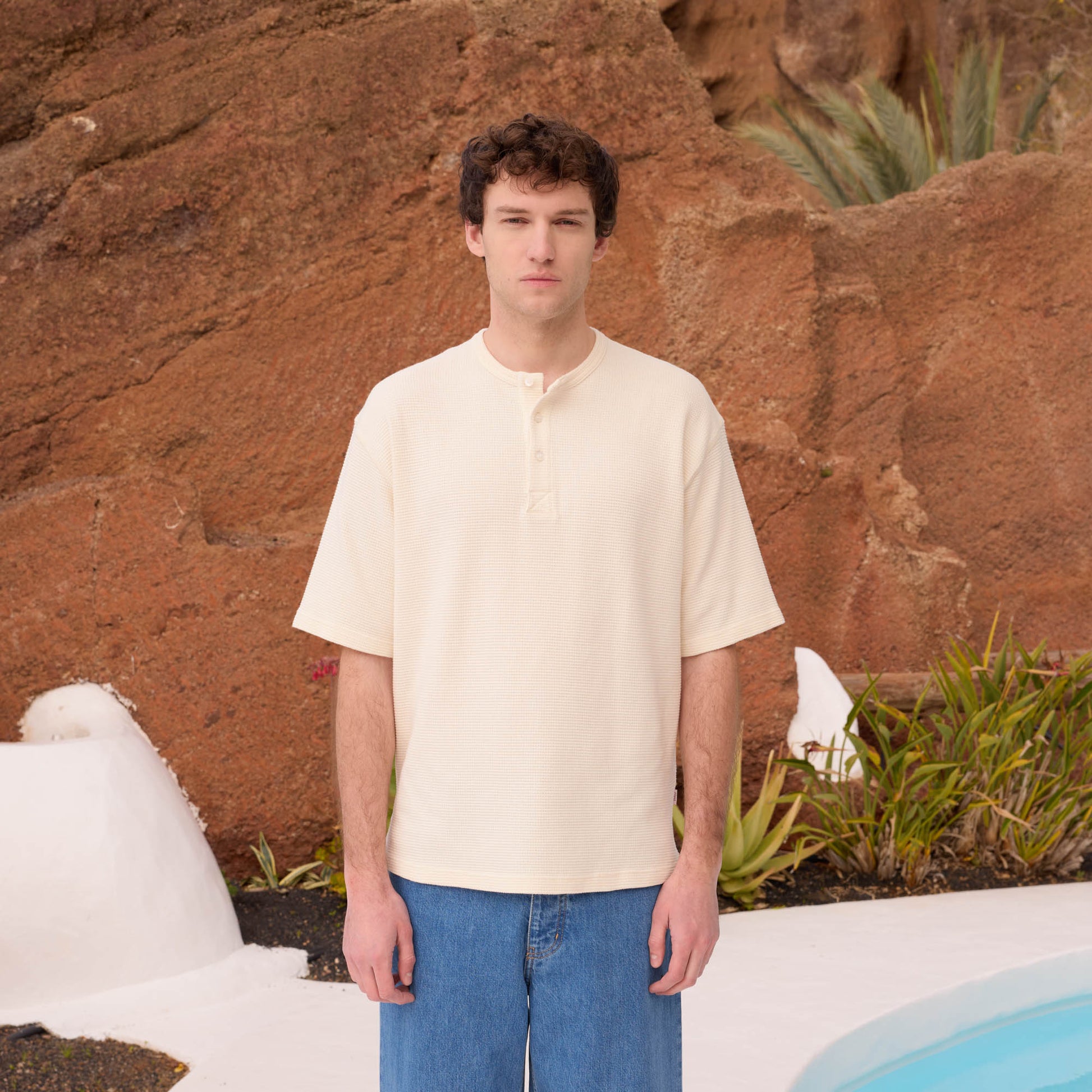 Ecru cotton Henley T-shirt, designed with clean lines and a more textured surface than classic jersey. Its generous cut gives it a natural drape, while the honeycomb effect discreetly adds depth.