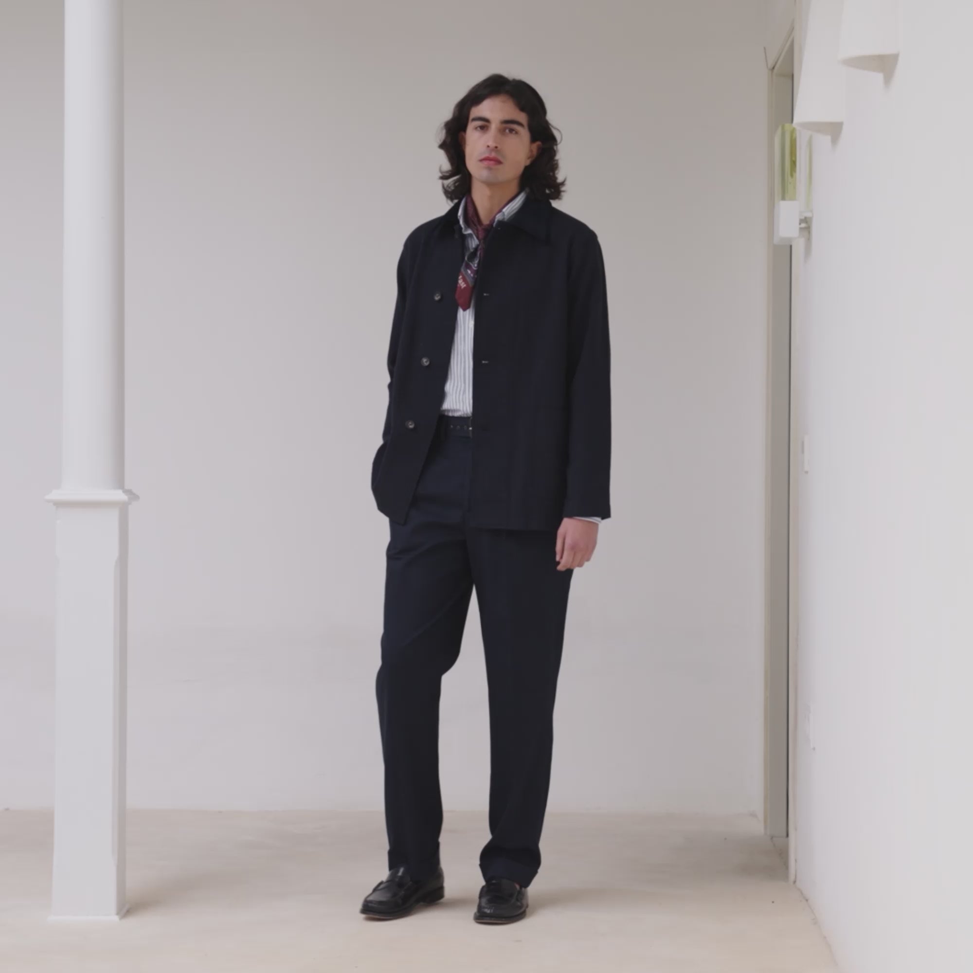 This 100% navy cotton work jacket has a striking texture. Its contrasting velvet collar adds a touch of elegance to this piece.