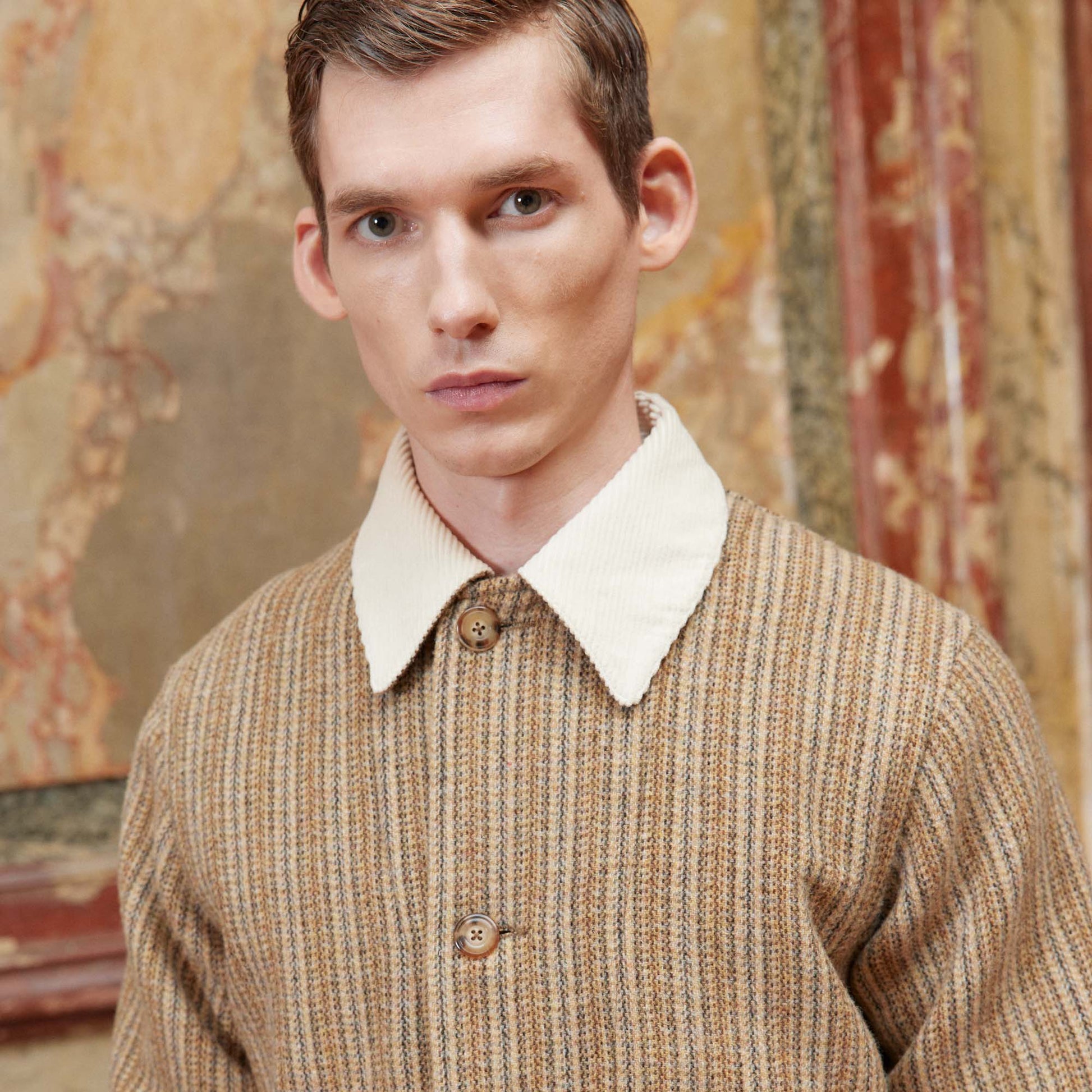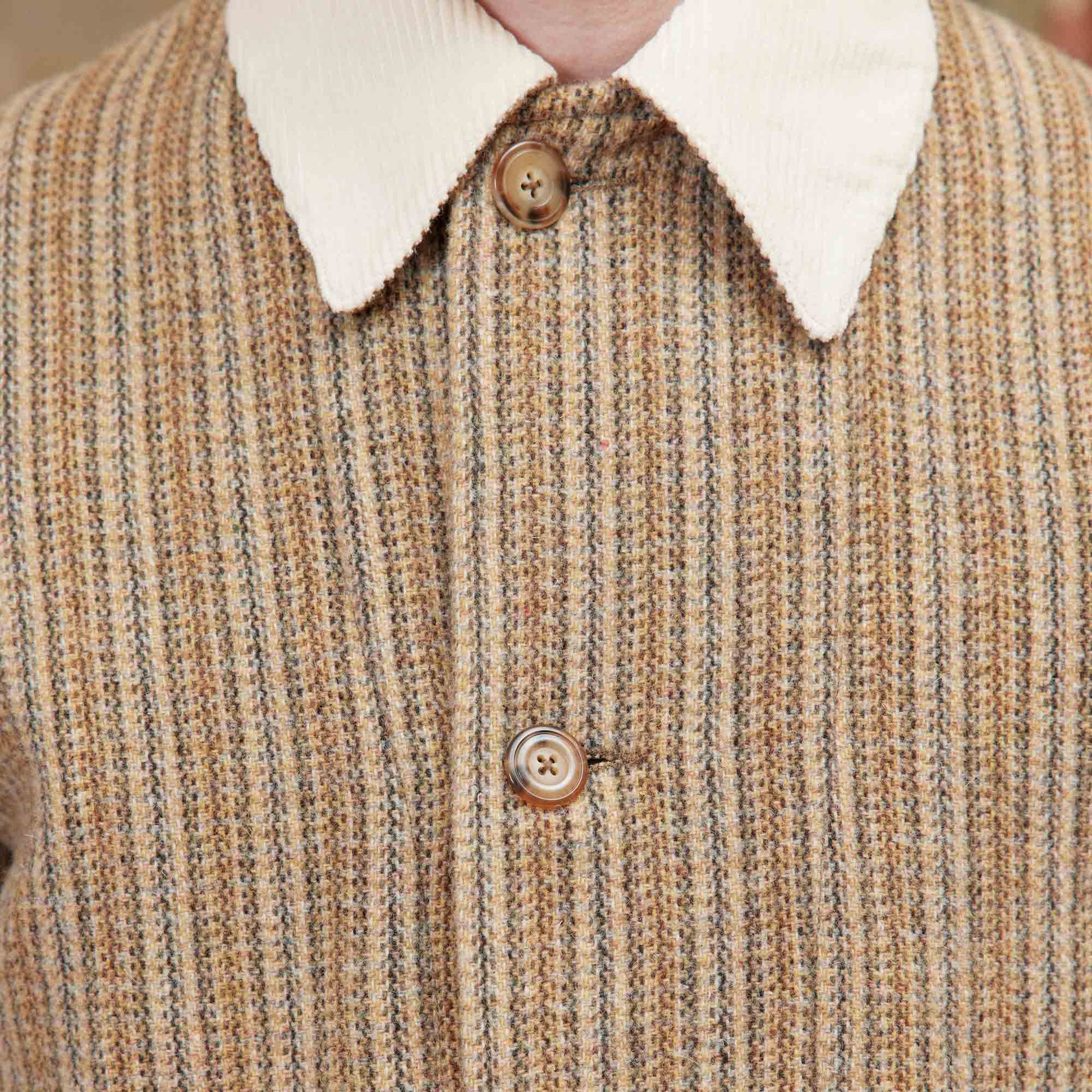 This work jacket is revisited in a slightly retro spirit, with its stripes and its contrasting ecru velvet collar. Made from a very beautiful Italian wool, it is an essential piece of the season.
