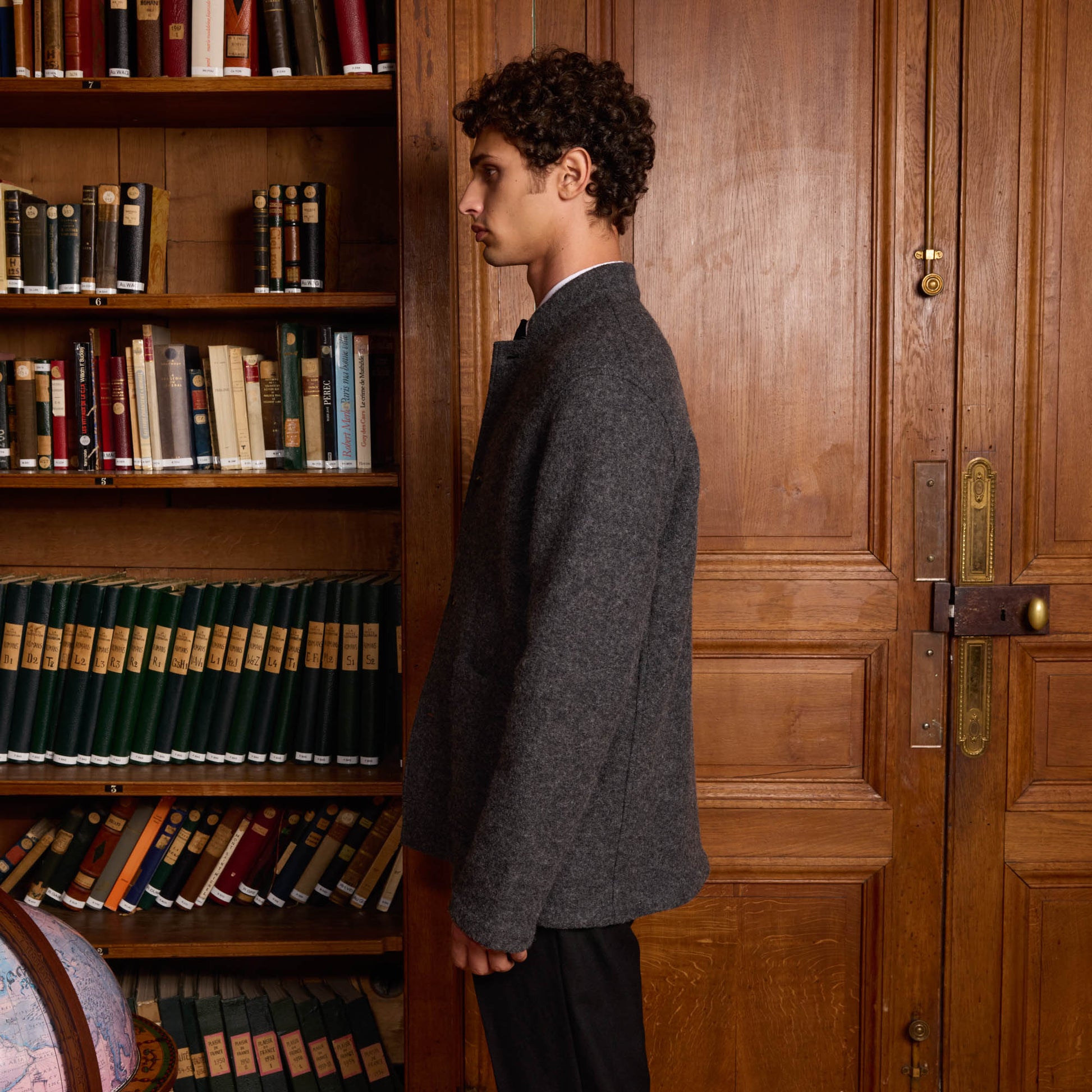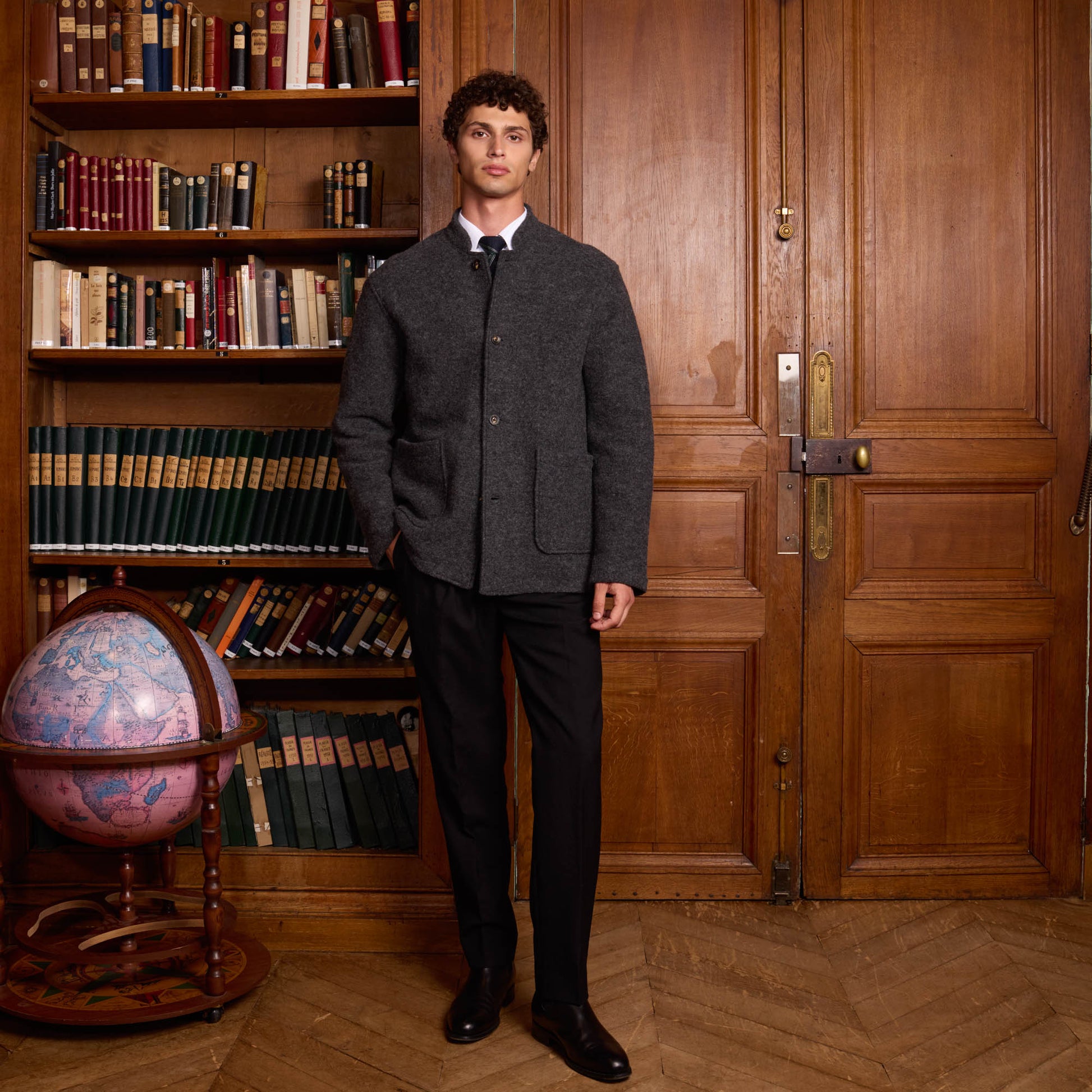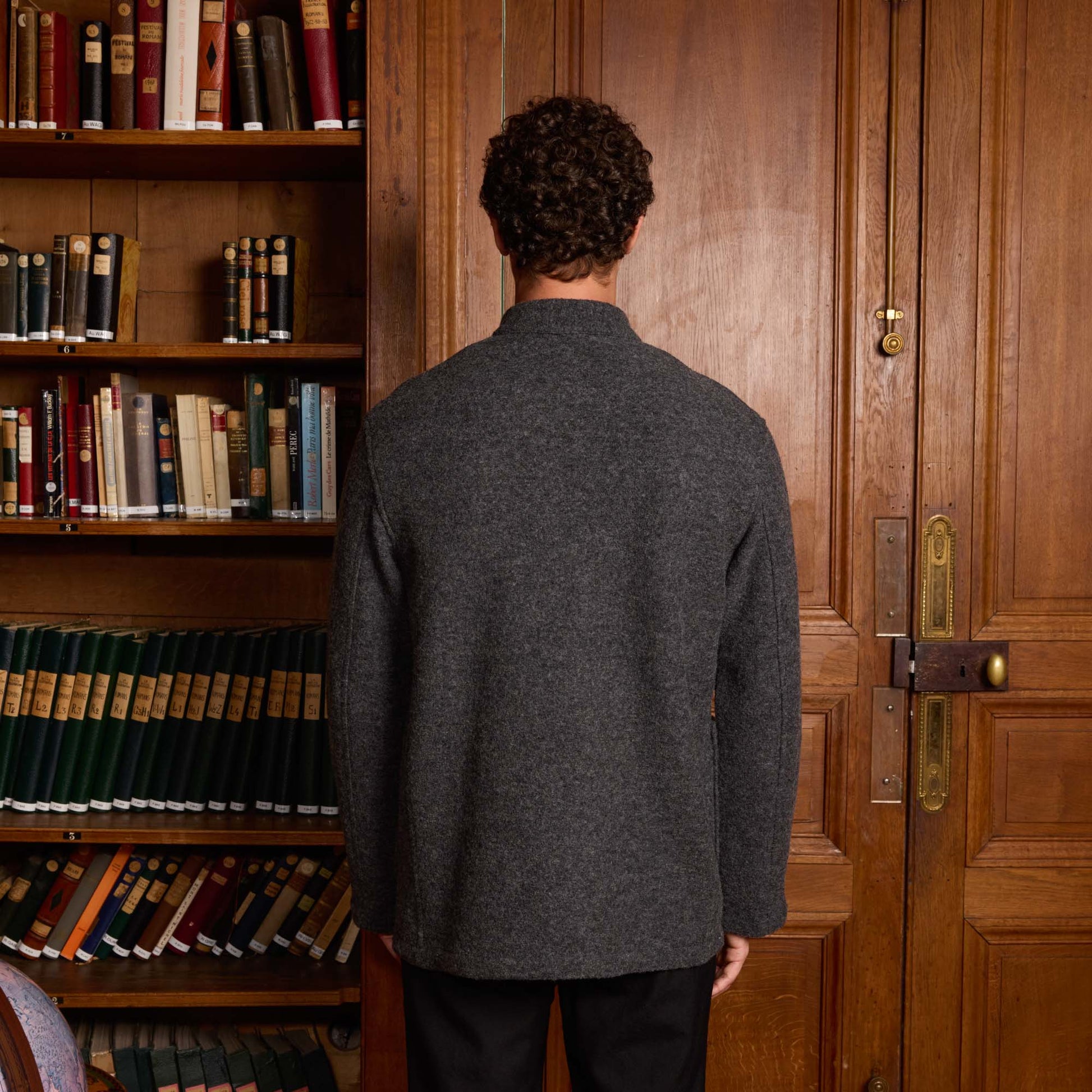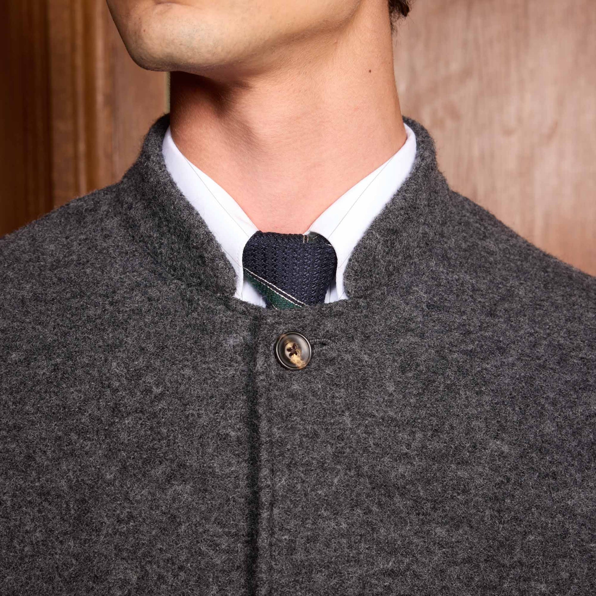 Crafted from Italian boiled wool, this work jacket features a collar without flaps for a contemporary touch. The wool's density, resulting from careful processing, guarantees excellent thermal insulation. A noble material, boiled wool is characterized by its richness, roughness, and pronounced texture.