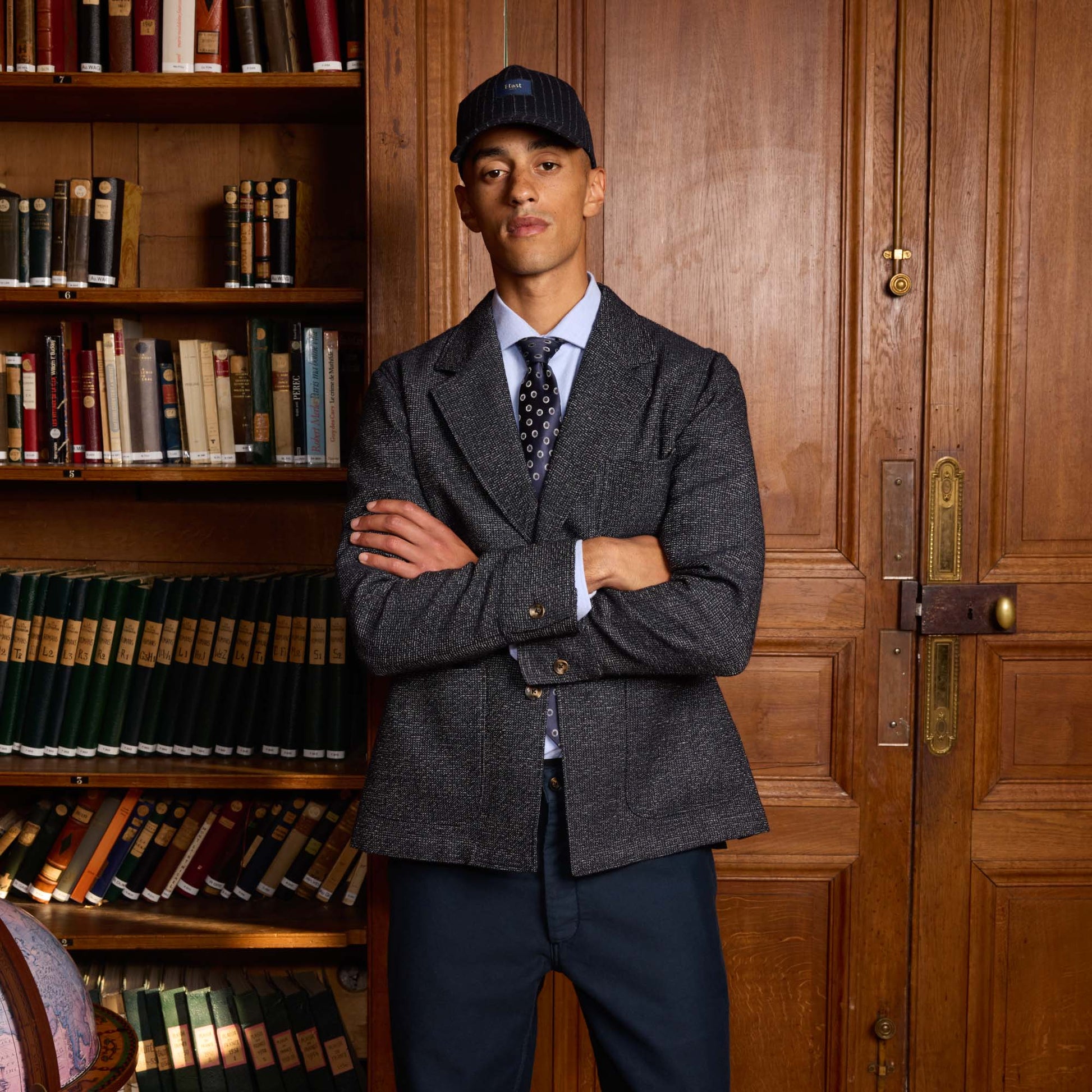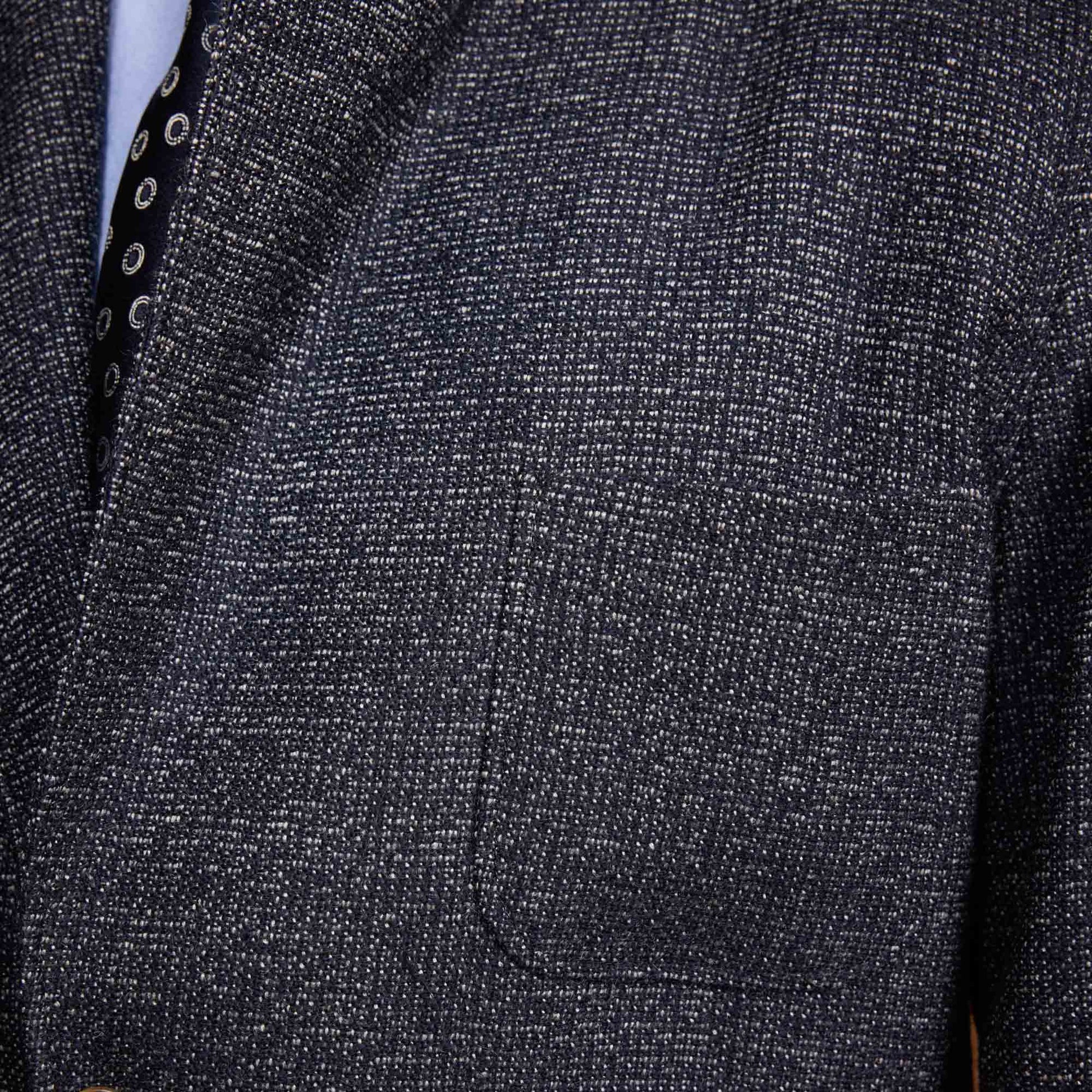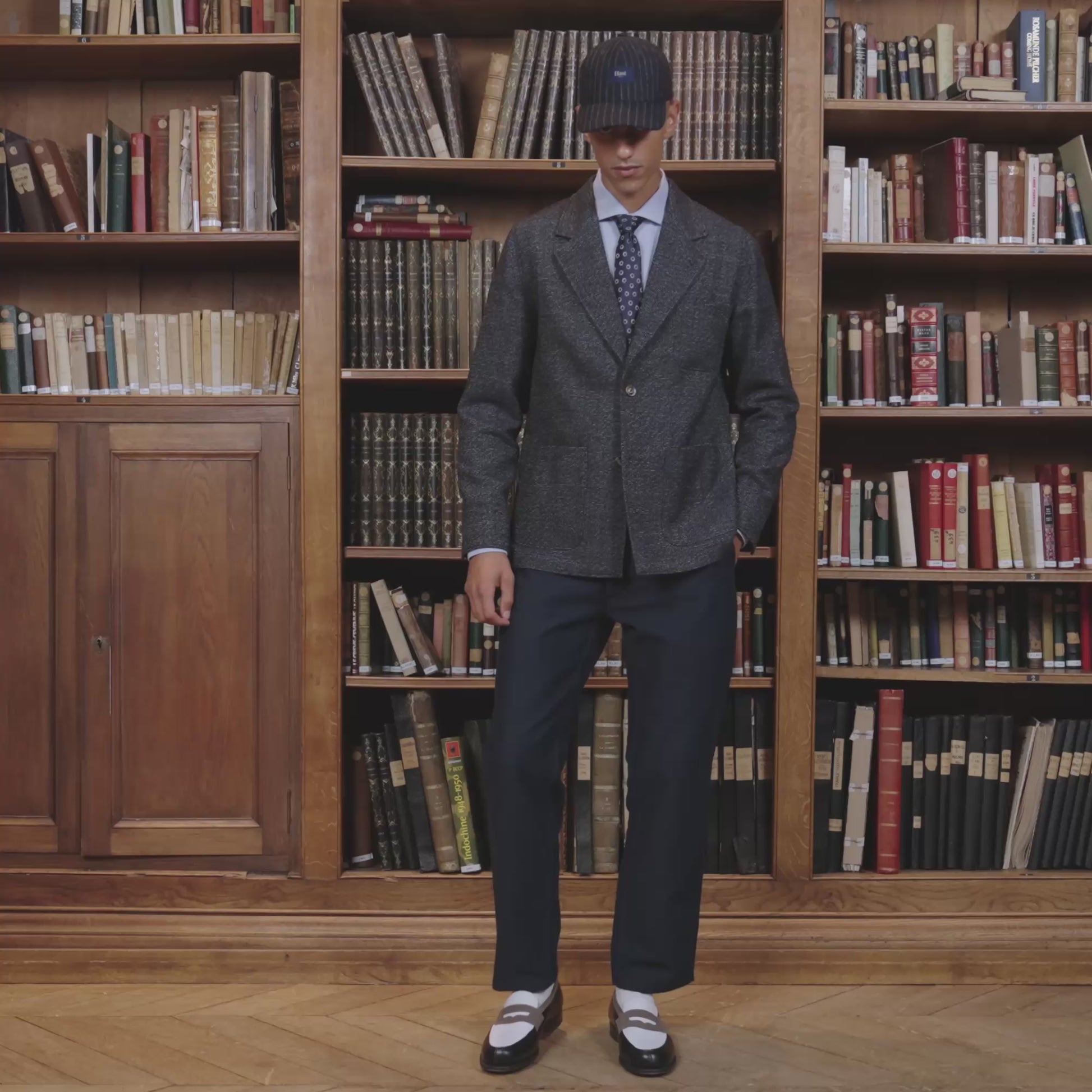 We have reworked the collar of our unstructured jacket in a tailored spirit. Made in an exclusive mottled navy fabric, it goes with absolutely everything. It is made in a beautiful Italian wool, with a raised weave that gives it a lot of character.