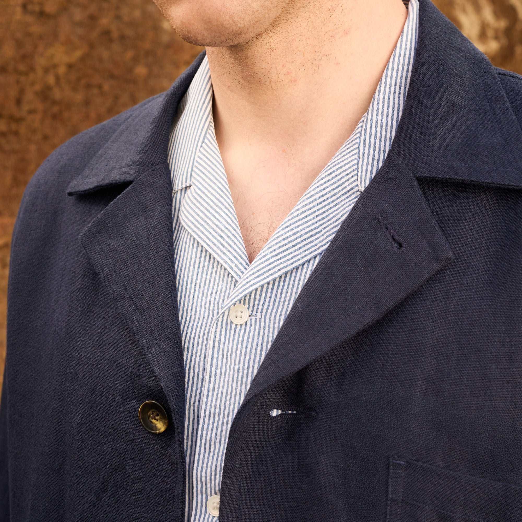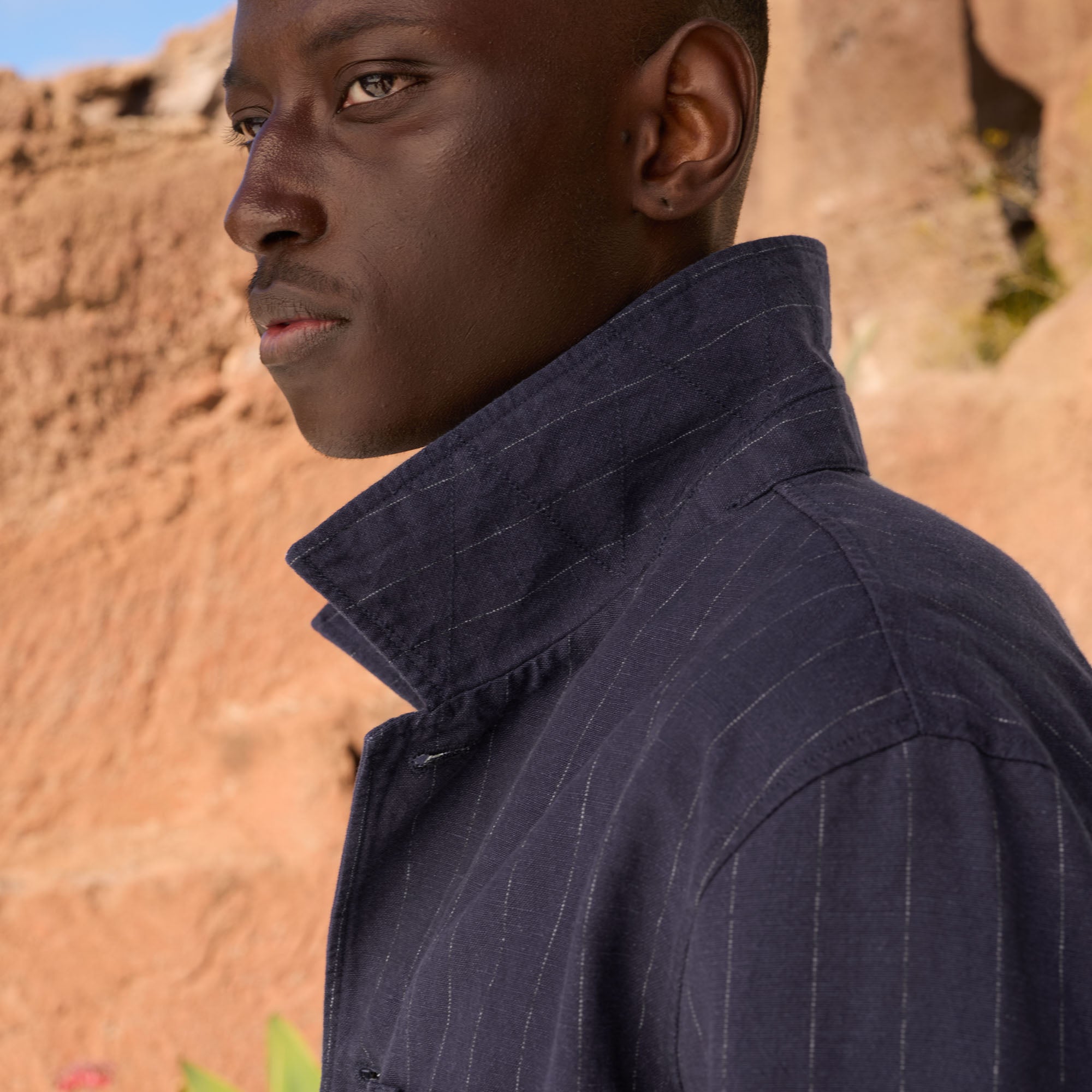 Veste atelier en lin et coton à rayures marine, construite autour d’une ligne utilitaire nette et d’une matière à forte présence. Sa coupe droite et ses poches plaquées en font une pièce facile à intégrer au vestiaire casual, avec un équilibre juste entre usage et élégance.