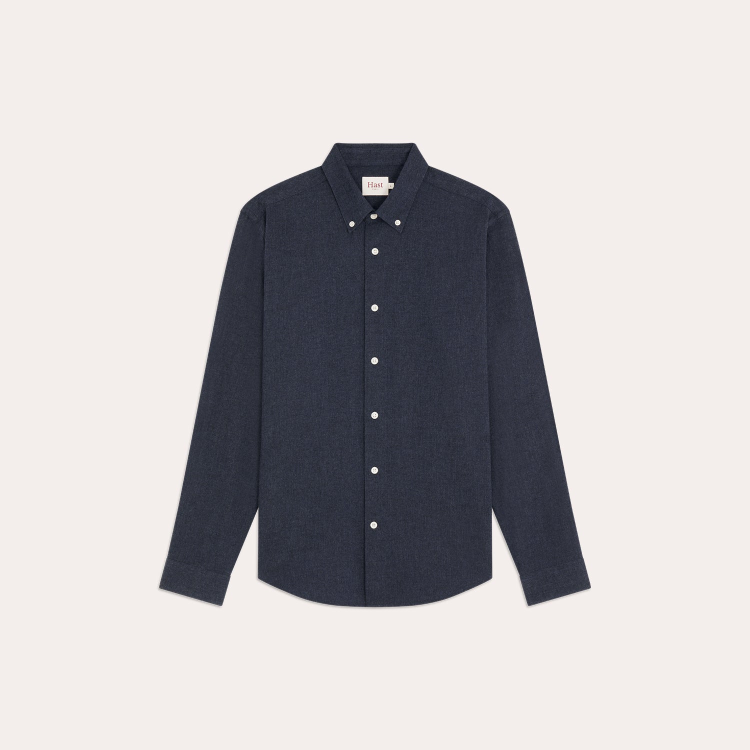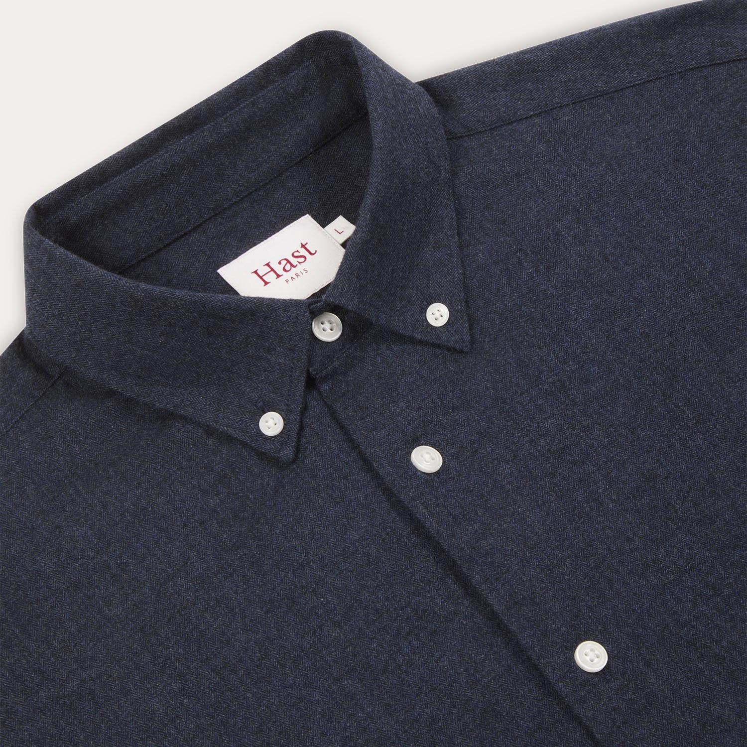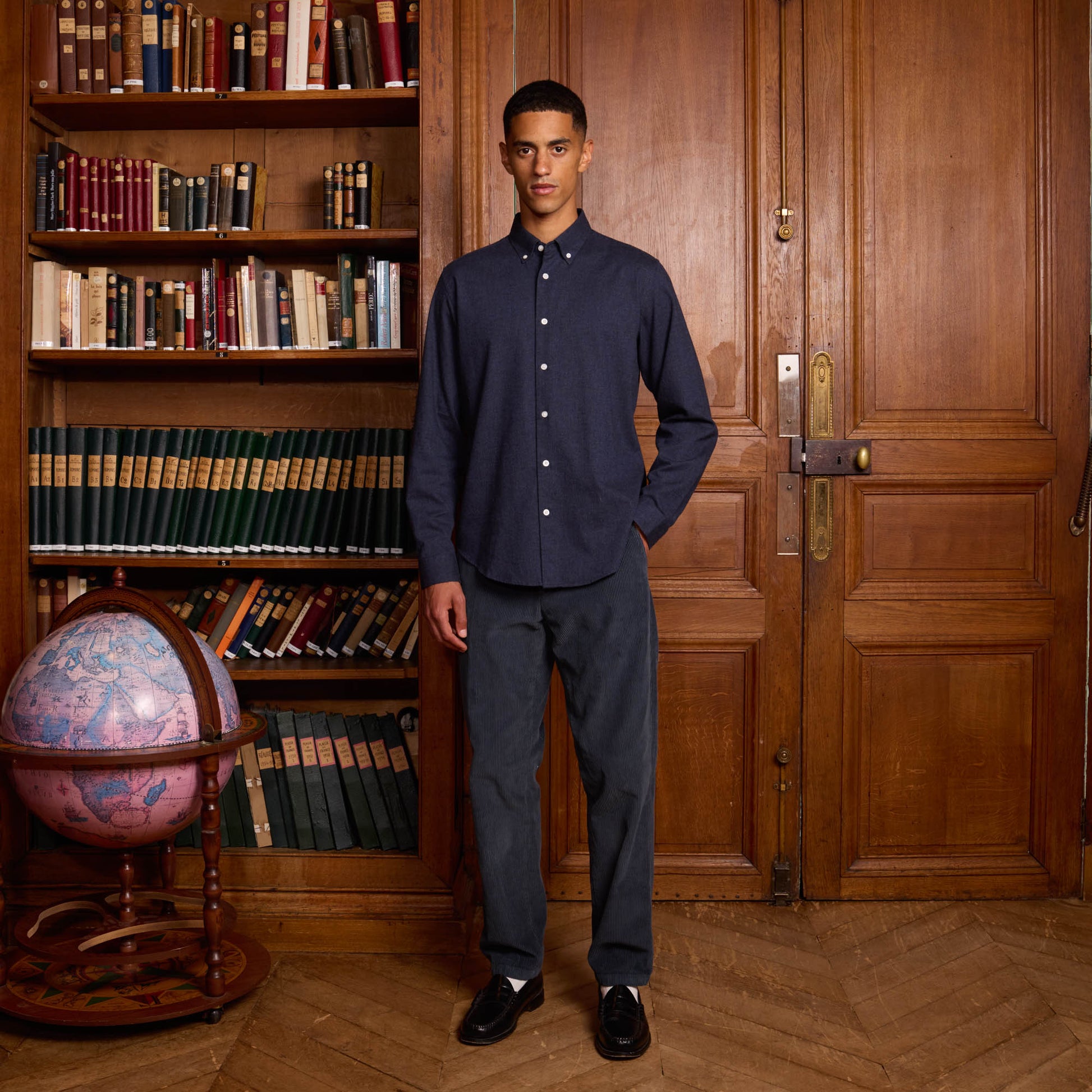 En flanelle de coton, l'aspect chiné ainsi que le tissage à micro-chevrons donnent du relief à cette chemise. Sa jolie couleur bleu nuit est une teinte profonde et élégante.
