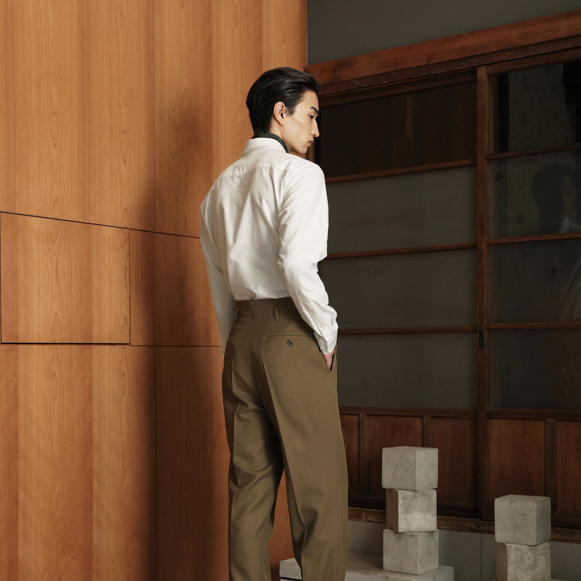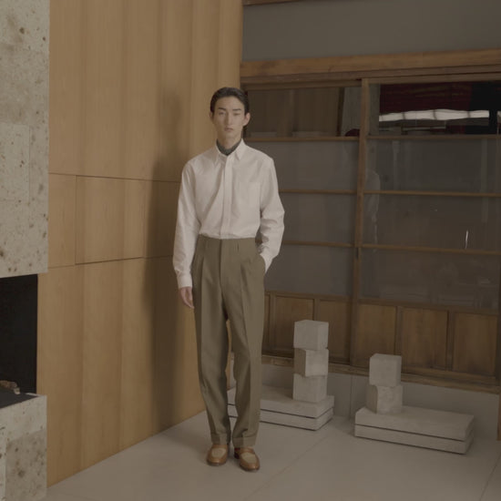 Né de la troisième étape de la collaboration Hast et Nona Source — la plateforme soutenue par LVMH, dédiée à la revalorisation des surplus de matières des Maisons de luxe les plus prestigieuses — ce pantalon à pinces incarne l'équilibre entre audace contemporaine et héritage couture. Confectionné en sergé de laine italien aux finitions délicates, il se distingue par ses proportions étudiées : taille marquée, jambe aisée et tombé gracieux. Les passants positionnés bas affermissent la ligne verticale, évoquant subtilement les silhouettes des années 50 réinventées par un regard actuel. Conçu pour s'adapter à la vie en mouvement, il fusionne prestance et liberté de mouvement. Une pièce d'exception dotée de caractère, jamais envahissante, qui trouve son expression complète associée à un blouson, une veste ou un pull pour une allure naturellement équilibrée.
