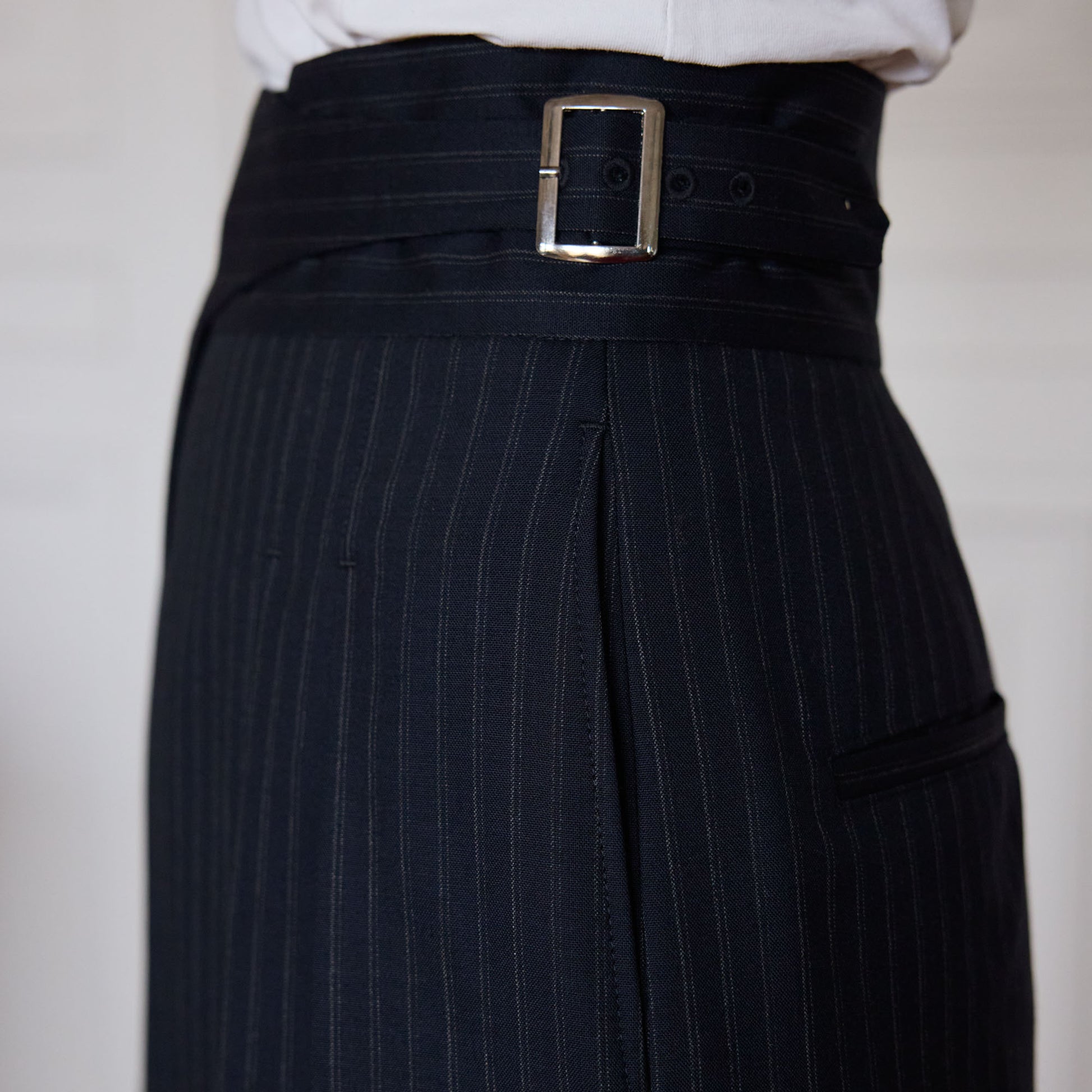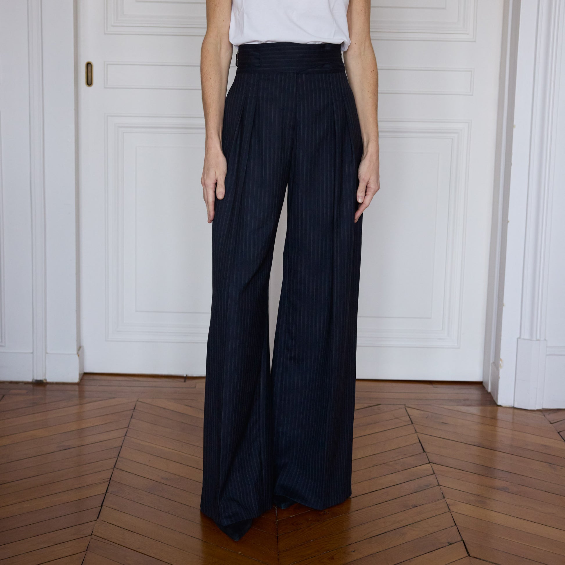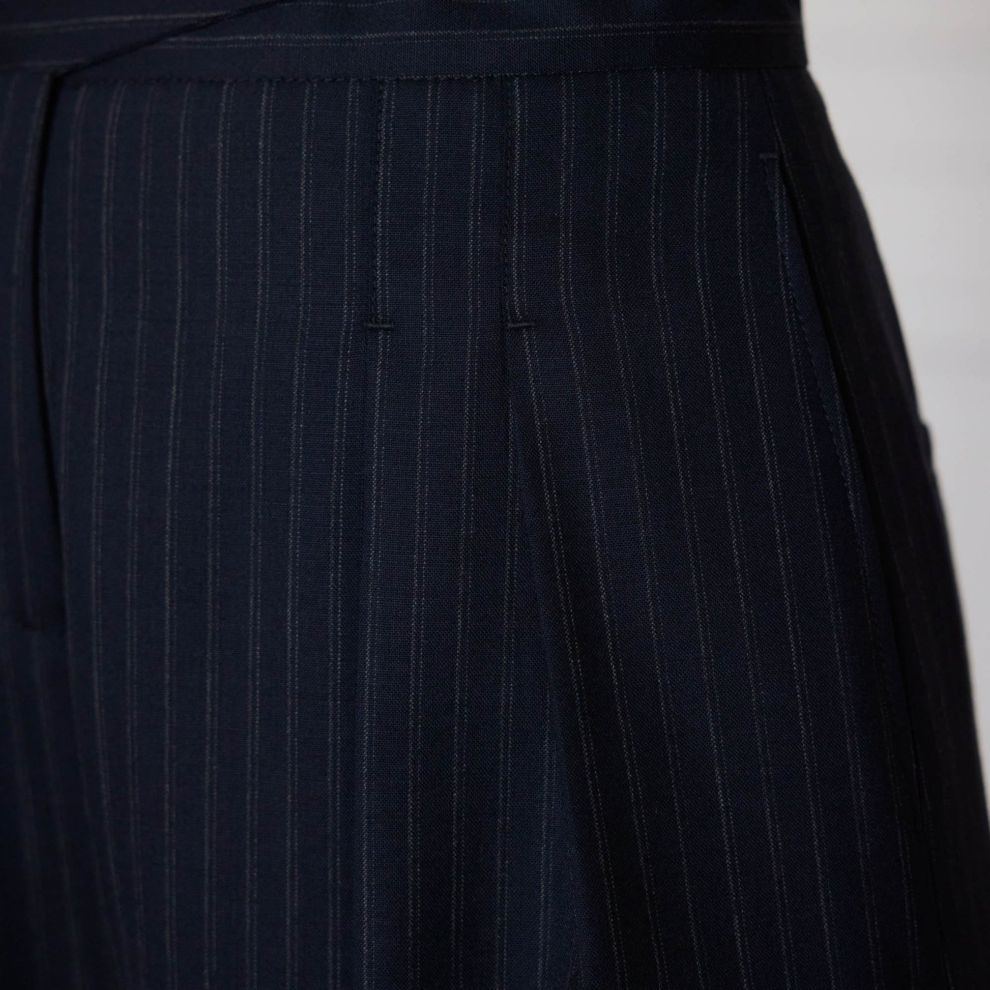 Les plis marqués, les poches arrière passepoilées et la poche côté discrète témoignent d’un soin extrême porté aux détails. Confectionné en 100 % laine rayée marine, il se porte aussi bien seul qu’en ensemble avec la veste assortie.