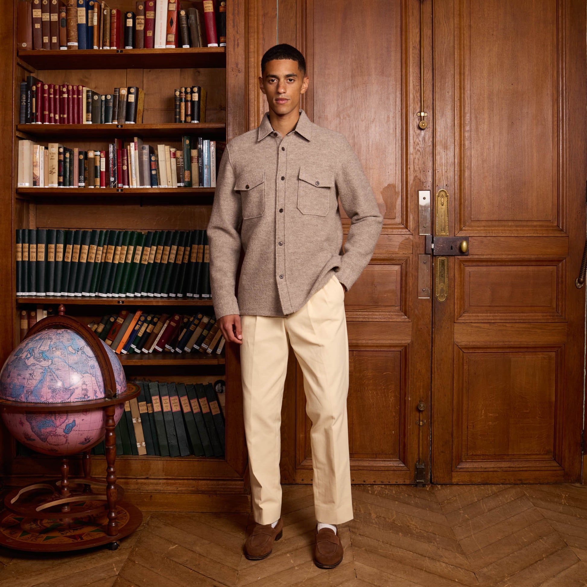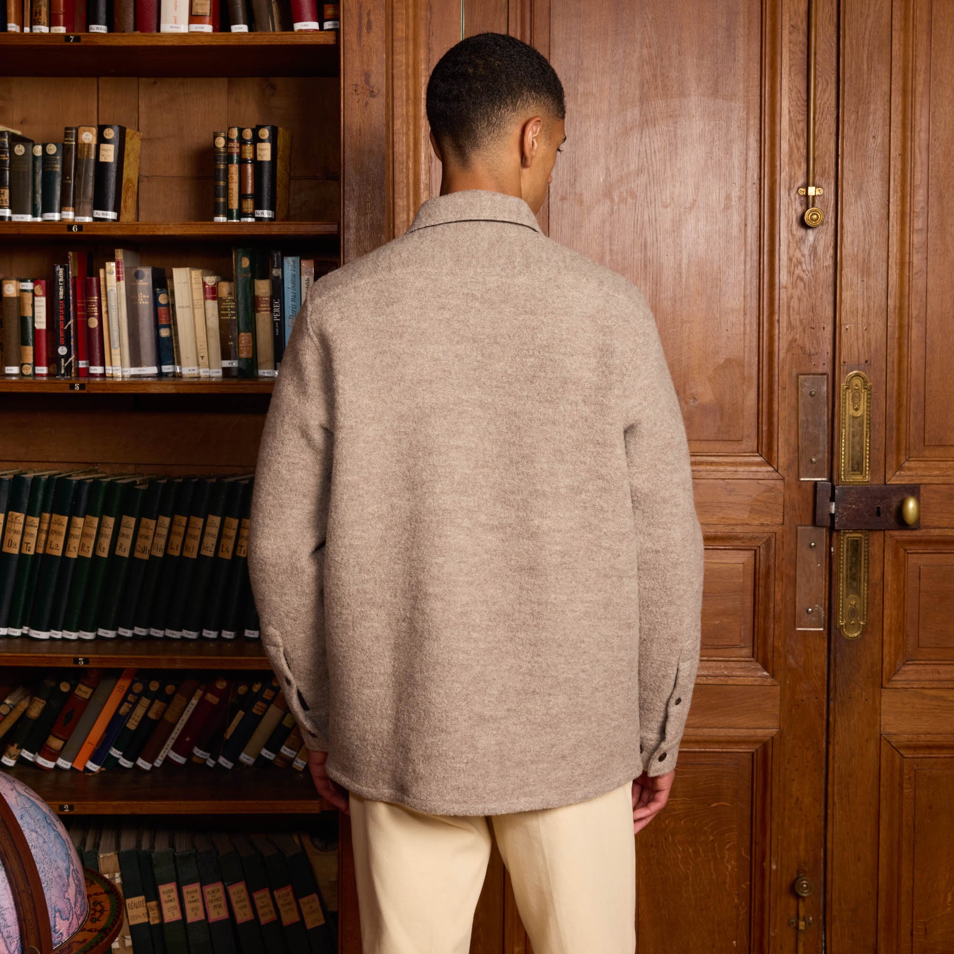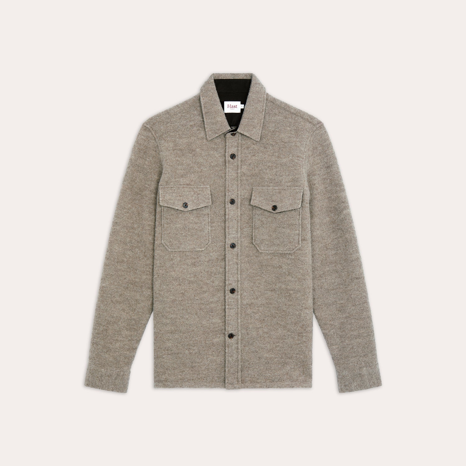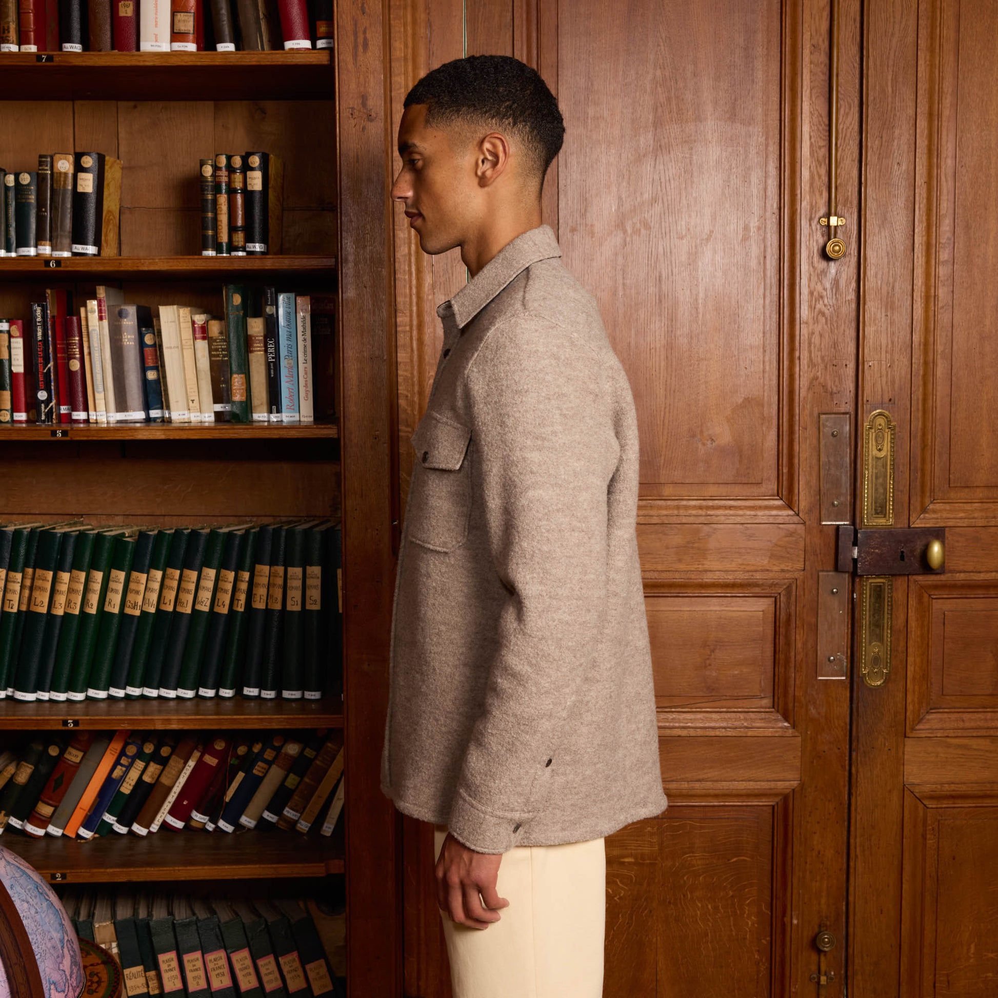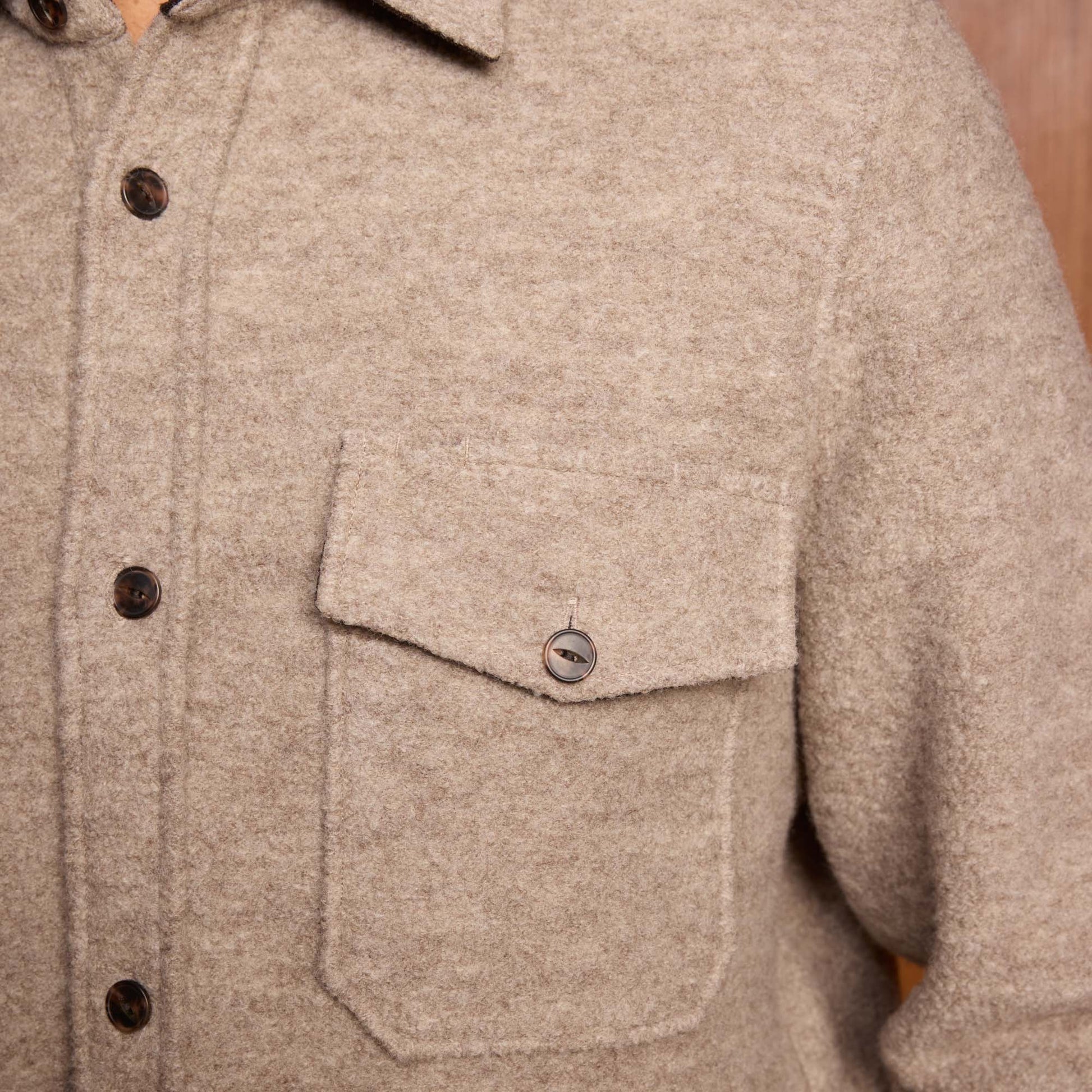 Pour la première fois, nous déclinons notre surchemise en laine bouillie italienne. C'est un tissu qui possède de nombreux bénéfices : il est épais, dense et d'une grande douceur. Son aspect duveteux lui donne une texture particulière avec beaucoup de relief.