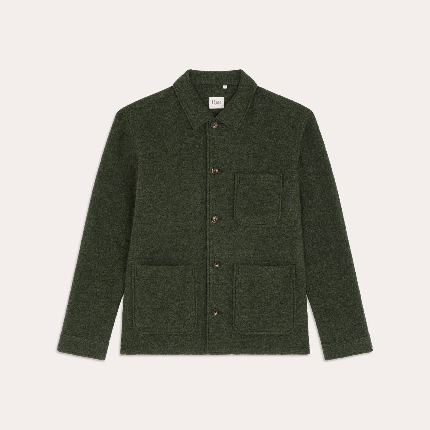 La laine bouillie italienne fait tout le charme de cette veste de travail. C'est en effet une matière dense, qui tient chaud grâce au travail fait sur la laine. La laine bouillie est également une matière riche, pleine d'aspérité et de texture.
